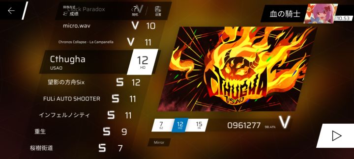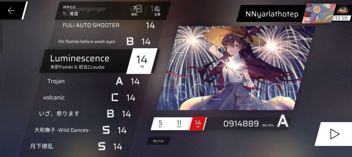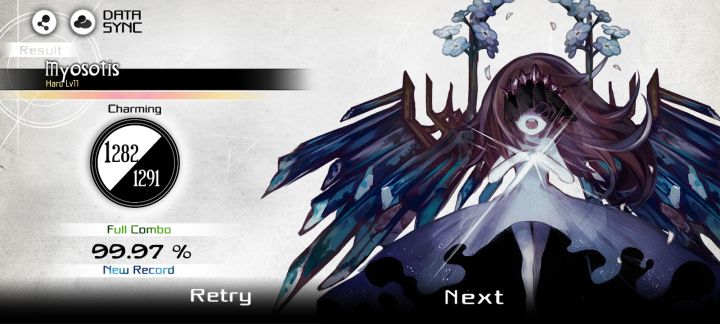 2022年4月13日傍晚 我怀揣着惴惴不安但又踌躇满志的心情 仅用一双拇指演奏着勿忘我 在第一次挺过所有发狂段后 呼吸开始急促 心跳开始加速 还好最后狠命hold住 演奏出27gr99.87%这作为初FC仍算可观的分数 那也是我仅凭拇指破天荒FC11 同时发自内心感激这个能被倒数第二难的11甩出N条街的最水且没有之一的11依然能予以我不可言说的成就感2022年12月31日 典中典年底冲业绩 直至