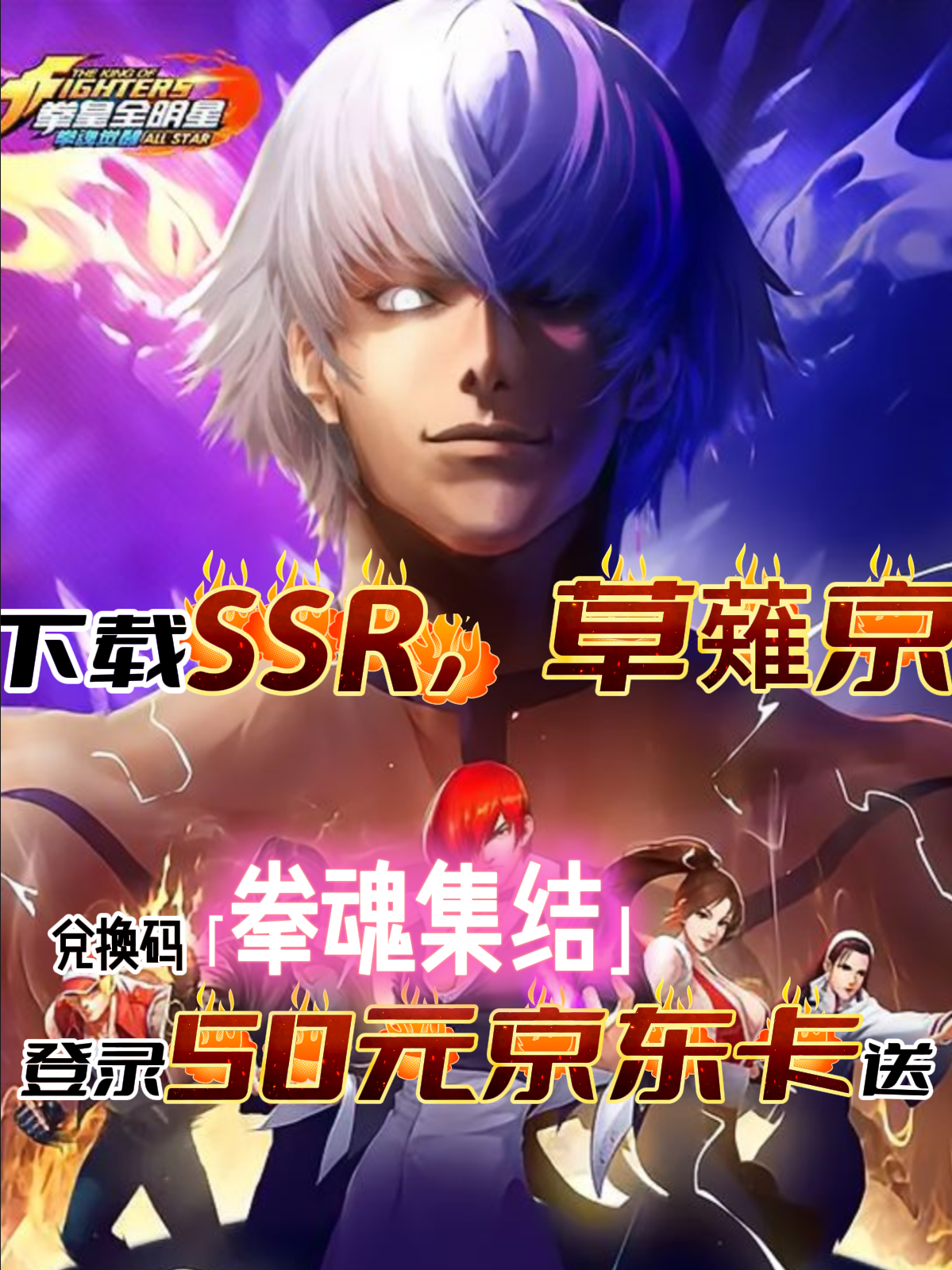 草薙京、不知火舞、特瑞全员集结,橘右京、娜可露露、霸王丸破界登场! ✅ 登录送 50 连抽(保底出 SSR,草薙京 / 橘右京必中其一) ✅ 回帖抽 50 元京东卡(1 个名额,晒预约截图就有机会) ✅ 兑换码「拳魂集结」速存!格斗币 + 觉醒石秒到账 登录送50元京东卡 + 限定角色礼包,错过血亏! 💥 游戏亮点: ▶ 经典角色全收录:草薙京的“百八式·暗拂”、不知火舞的扇子雨、特瑞的“能量