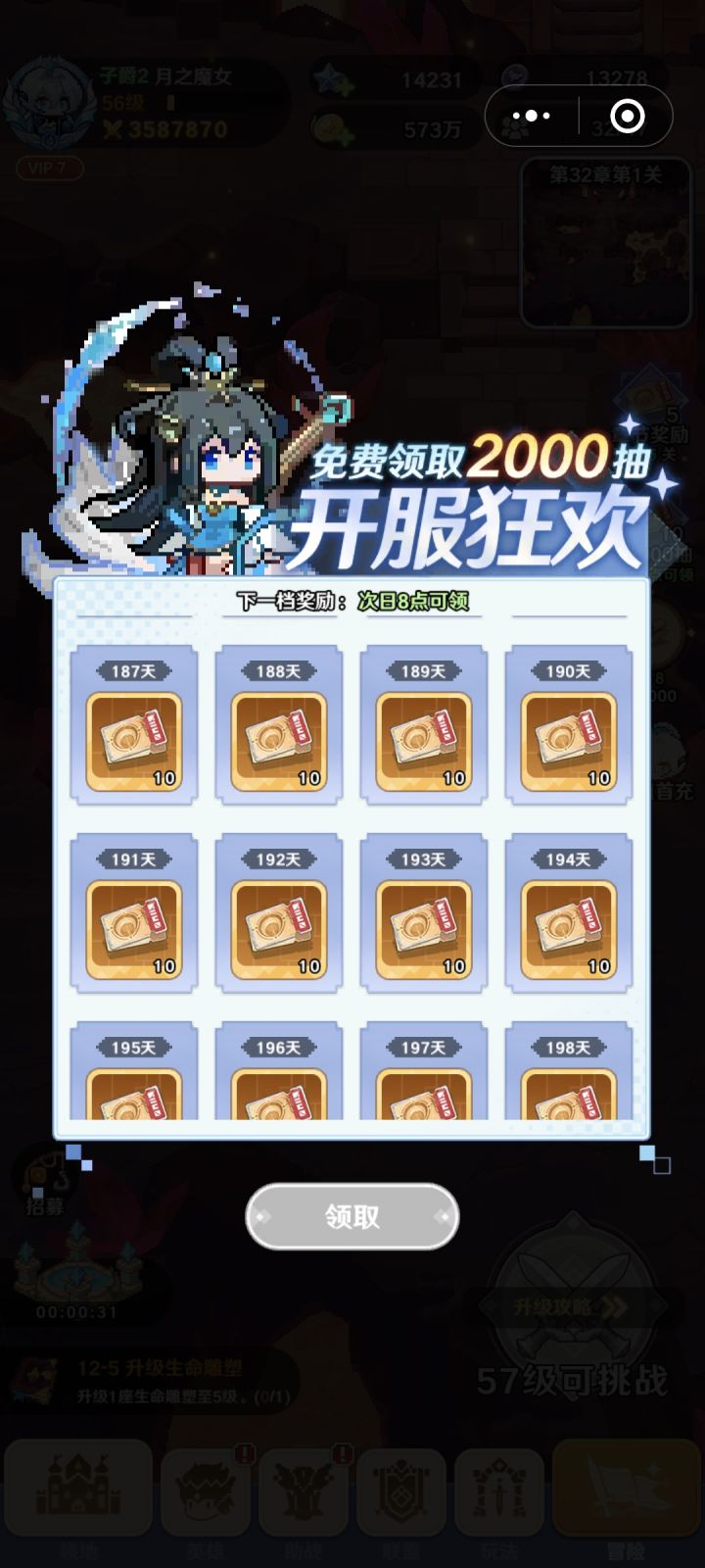 ZJ666 星钻 ×20、升阶棱晶 50ZJ777 限定皮肤「星夜魔女」、抽卡券 ×10,或金币 30000、星钻 ×20ZJ888 限定皮肤「星夜魔女」、抽卡券 ×10,或星钻 ×20、装备强化石 ×20XS666 星钻 ×500、紫色符文 ×3,或星钻 ×20、升阶棱晶 50XS777 金币 30000、星钻 ×20XS888 星钻 ×500、紫色符文 ×3,或星钻 ×20、装备强化