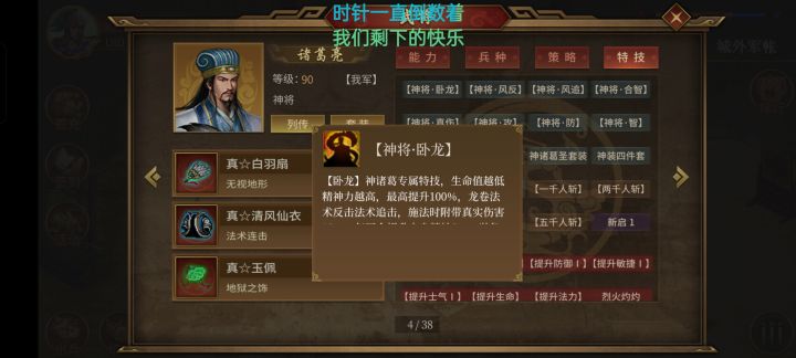 我所选取的是地狱50的档过挑战一,虽然拿着历史百周的奖励,但后面的成就特技属于锦上添花。我军属性如图二张飞属性即可保证只受真伤威胁。配置如下:一路:刘备:一阶皮即可,主要是白虎,装备最好带有恶路移动和恢复自身状态的,防具带饕餮甲保着简雍不被第一回合秒掉,锦上添花之举给刘备历史90周的受击回血。简雍:粮车➕圣漆黑道袍在刘备身边苟活,重点行军加速,撑过第一回合引伏兵即可。二路:司马懿:神将圣套