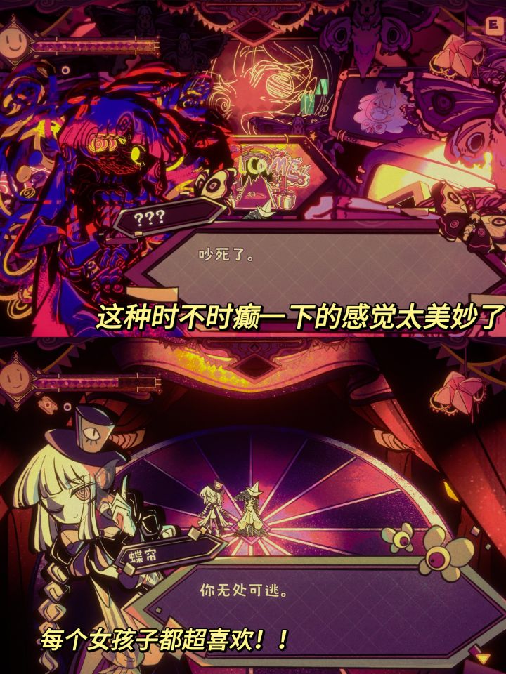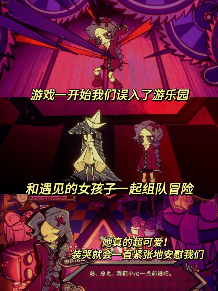 游戏:幻象游园剧平台:steam 质量这么高的免费游戏为什么这么冷门!玩完想给作者起立鼓掌的地步👏🏻画面演出都非常华丽,音乐也超好听,很难想象这是一个人做出来的游戏! 游戏一开始我们的灵魂误入了一个不太正常的游乐园,遇见了一群精神状态十分美丽的女孩子,认识了一个巨巨巨可爱的好朋友,一起结伴闯乐园。 玩法是解谜+一丢丢追逐战,难度不高,但注意光癫痫警告⚠️ 游戏现在虽然是demo阶