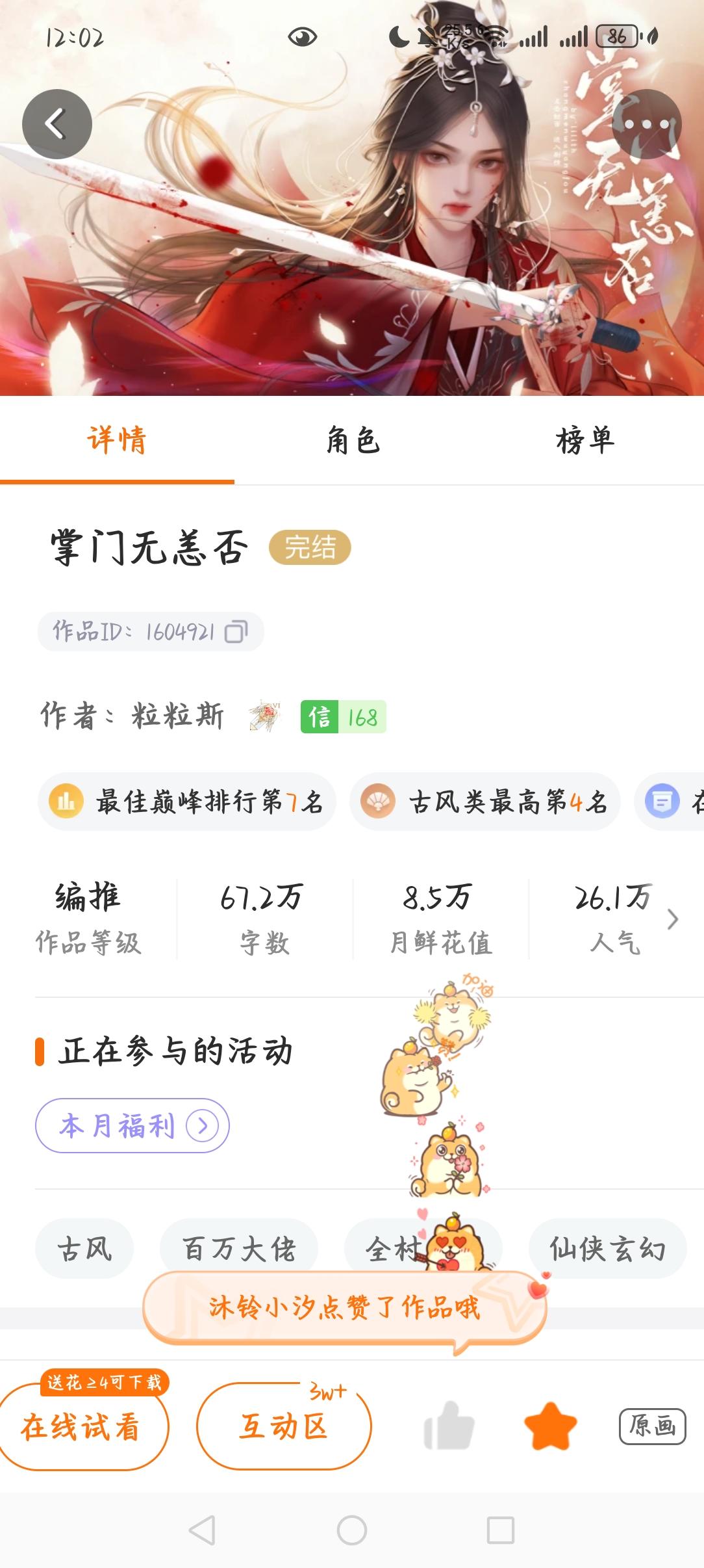 剧情向的文,目前在参与本月福利,花橙子就能买 #橙光 #掌门无恙否