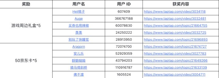 感谢大家积极参与本次活动,恭喜以下幸运小伙伴获奖!目前个人信息系统正在维护中,请获奖的小伙伴于【维护结束- 11月6日】时间段内,按以下方法填写个人信息,以便接收游戏周边,详情见下图。【方法一】直接点击跳转进入个人资料编辑内【收件人地址】填写。【方法二】在TapTap网页端进入【个人中心】进入【资料编辑】-【收件人地址】填写。我们也会在维护结束后发送站内信通知,第一时间提醒各位填写收货信息