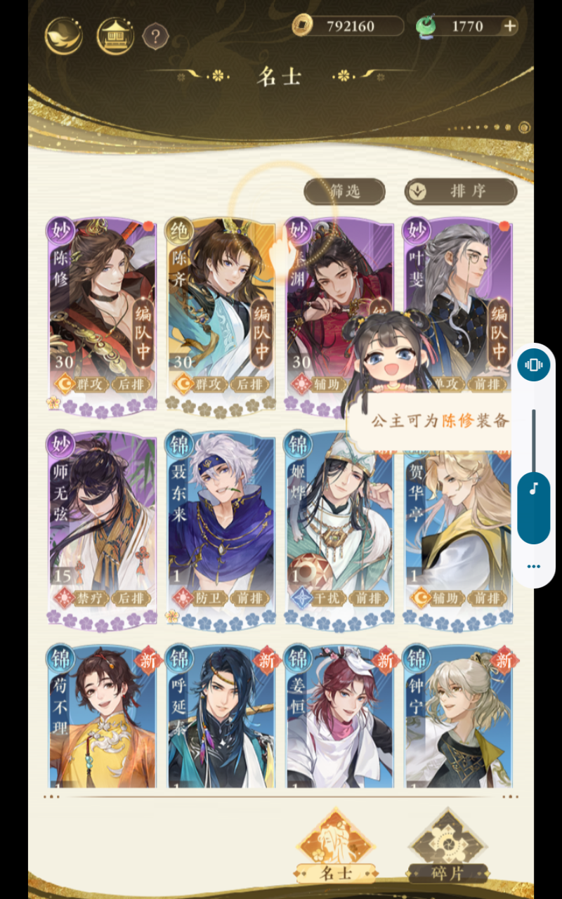 一看双金 66666,再一看,这俩角色我都没有,o( ̄▽ ̄*)ゞ)) ̄▽ ̄*)o,我只有顾某,陈奇,青魂,话说如果带不匹配的绝加成是不是比不匹配的妙要好啊#摇光录:乱世公主