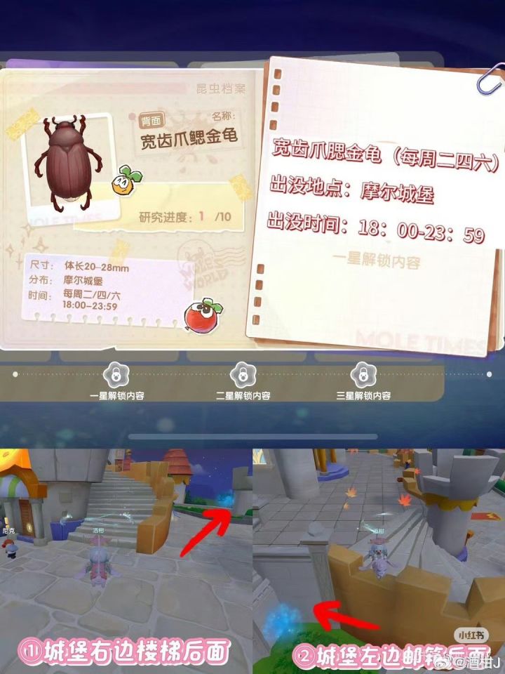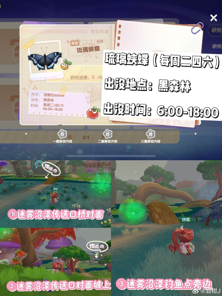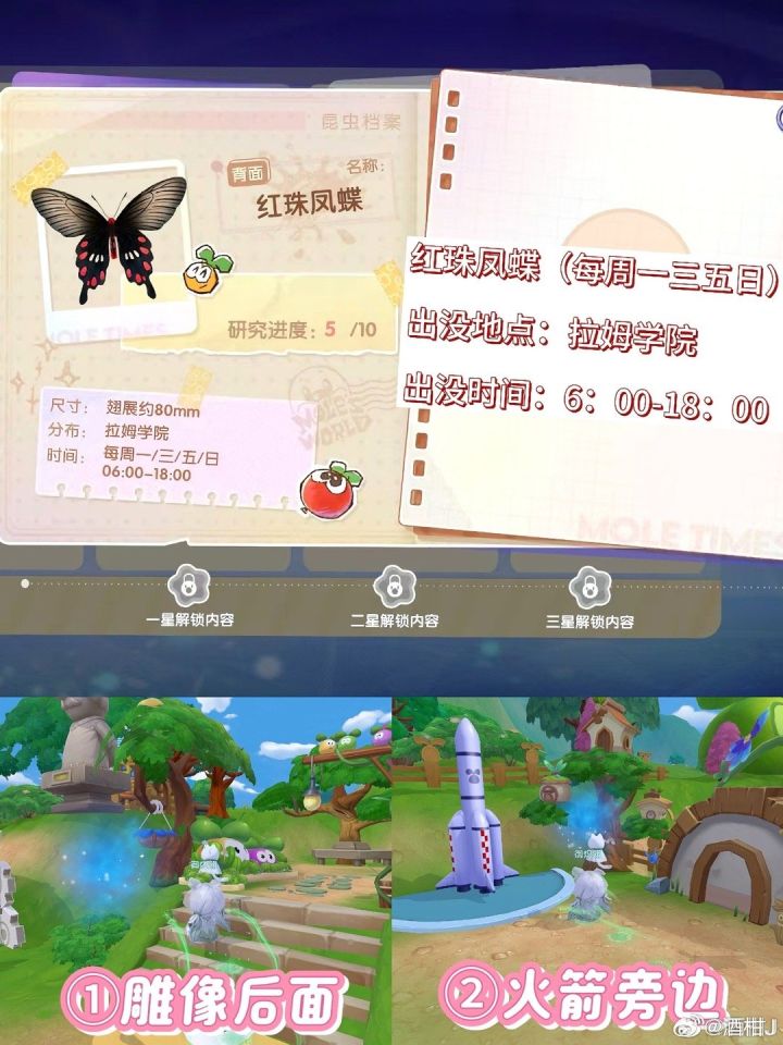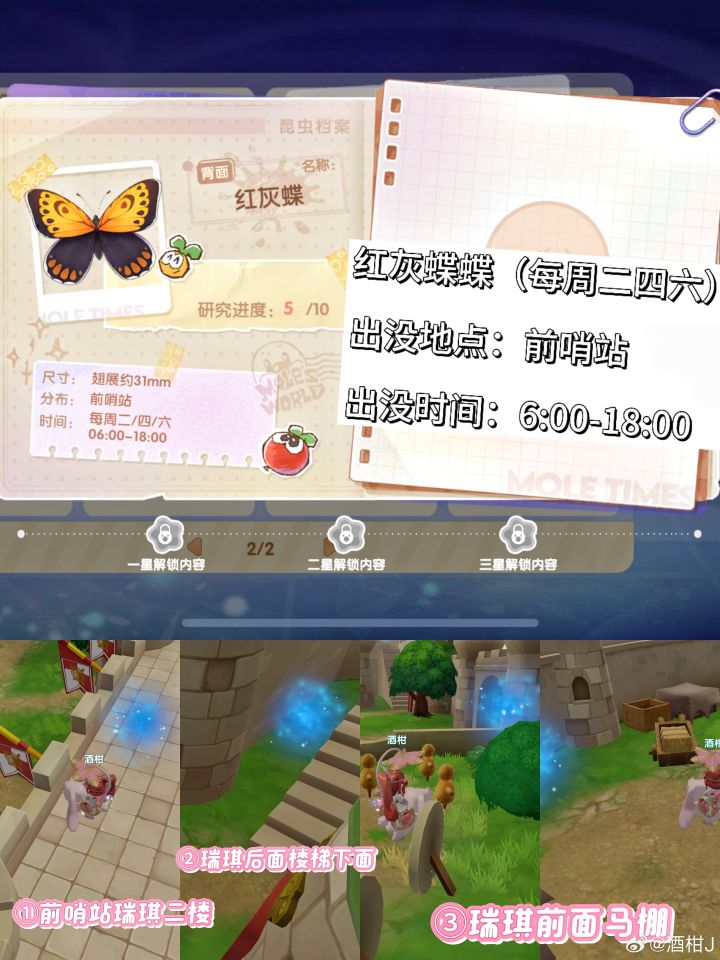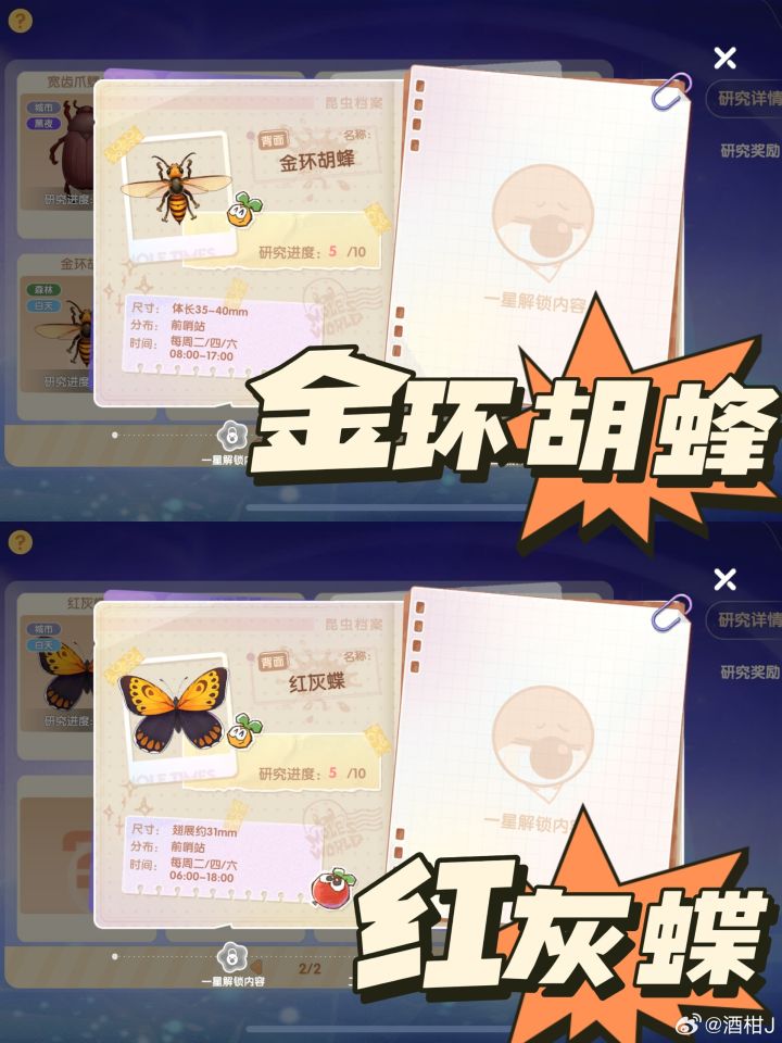 #摩尔庄园攻略 #摩尔庄园 #摩尔庄园上海自然博物馆联动 ⚠️每天每种昆虫仅可抓5只❗必须先完成主线活动小组课题❗⚠️功能-脚印-百宝箱(持续更新ing🧚🏻♀️)🌈✅金环胡蜂(每周2️⃣4️⃣6️⃣)-前哨站【出没时间:8:00-17:00】🌈✅红灰蝶(每周2️⃣4️⃣6️⃣)-前哨站【出没时间:6:00-18:00】🌈✅琉璃蛱蝶(每周2️⃣4️⃣6️⃣)-黑森林【出没时间:6: