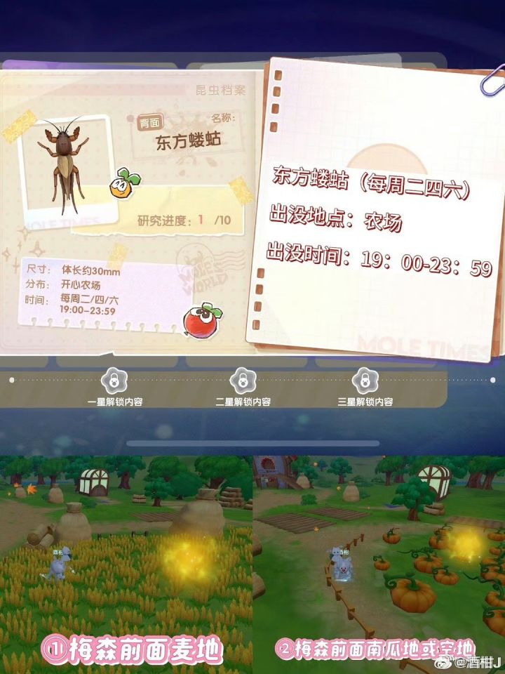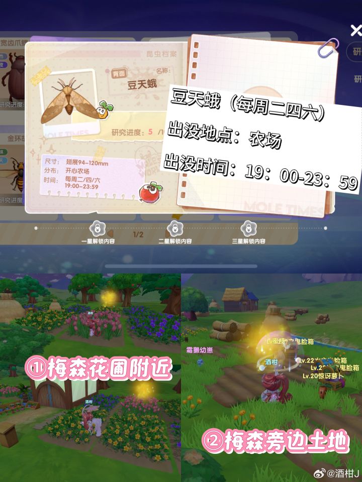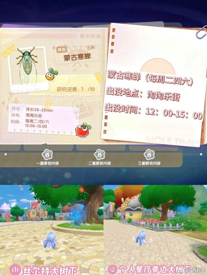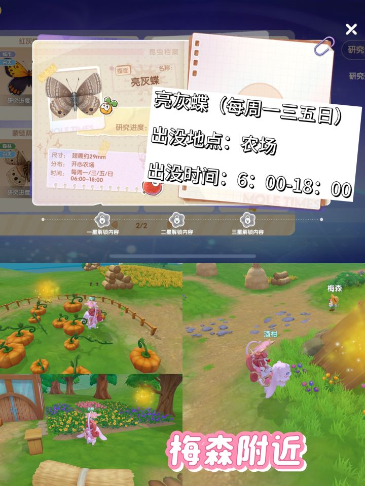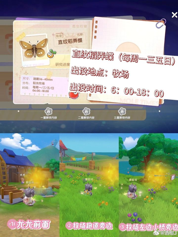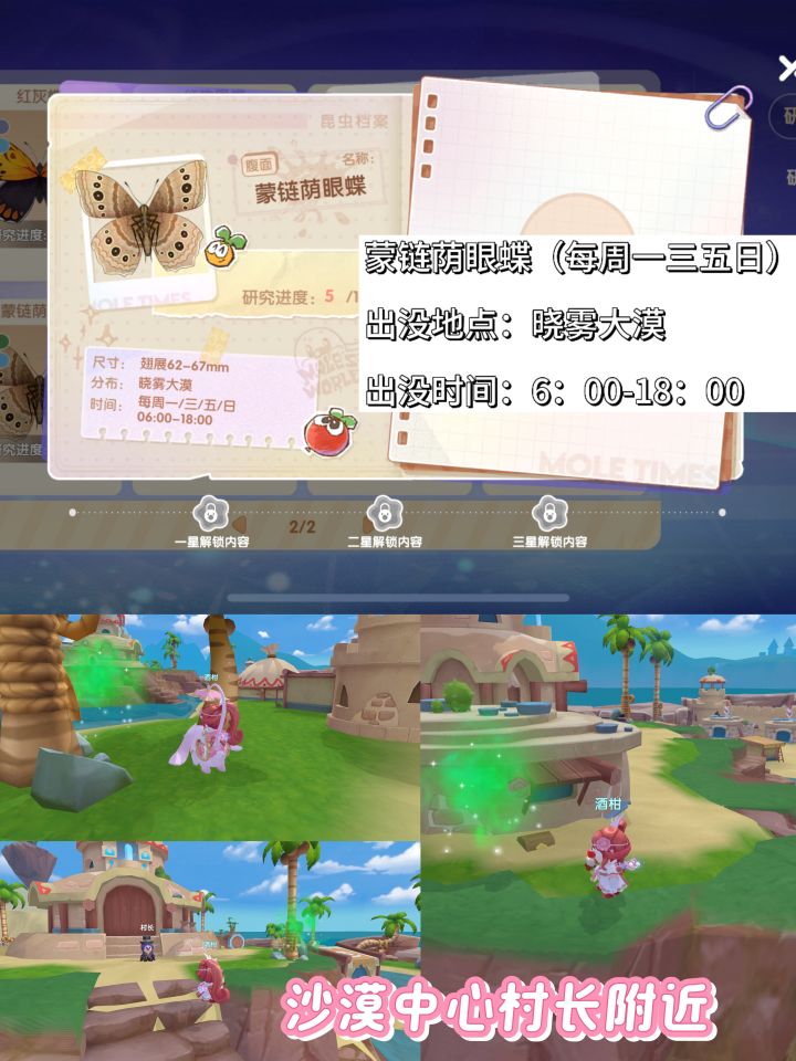 #摩尔庄园 #摩尔庄园上海自然博物馆联动 #摩尔庄园攻略 ⚠️每天每种昆虫仅可抓5只❗必须先完成主线活动小组课题❗⚠️功能-脚印-百宝箱🌈✅蒙链荫眼蝶(每周一三五日)-晓雾大漠【出没时间:6:00-18:00】①沙漠中心村长附近🌈✅亮灰蝶(每周一三五日)-农场【出没时间:6:00-18:00】①梅森附近🌈✅楝星天牛(每周一三五日)-牧场【出没时间:8:00-16:00】①气球