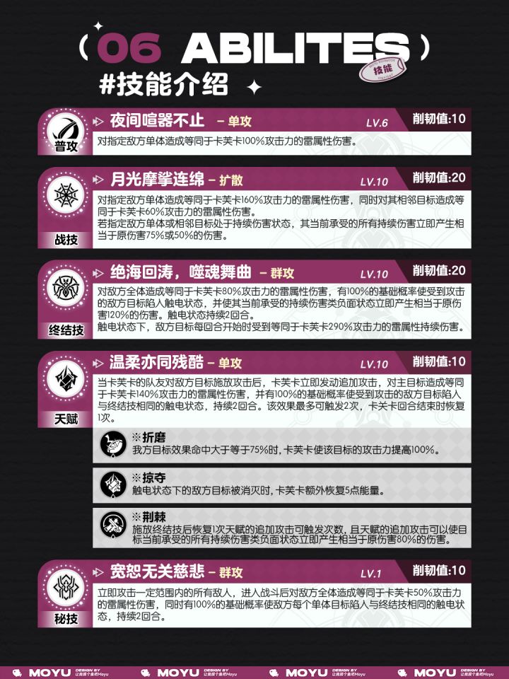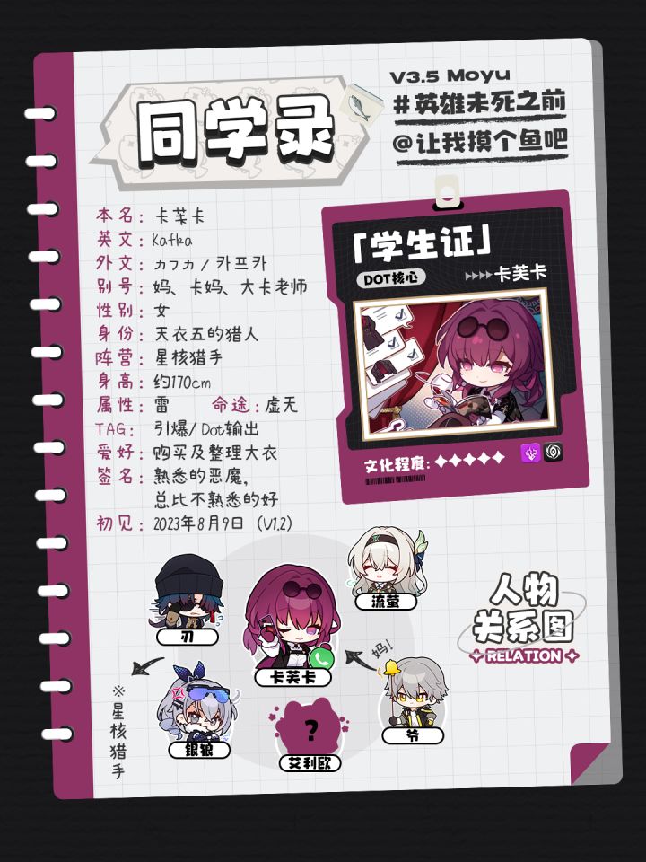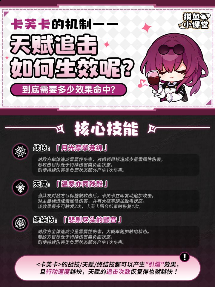 UID:104347362将将!我是摸鱼 (。•̀ᴗ-)✧DOT队从1.x版本C到3.x版本的核心又复刻啦!(冲啊,DOT队赛高!)本期的主角就是她 —— 星核猎手·『卡芙卡』!接下来是本期的《摸鱼小课堂》时间!卡芙卡坠坠重要的机制,一!定!要!看!懂!—————— ฅ՞• •՞ฅ ———————欢迎喜欢《摸鱼笔记》系列的同学萌前去主页报到!觉得有用的话一定要💓摸鱼酱哦!好了,