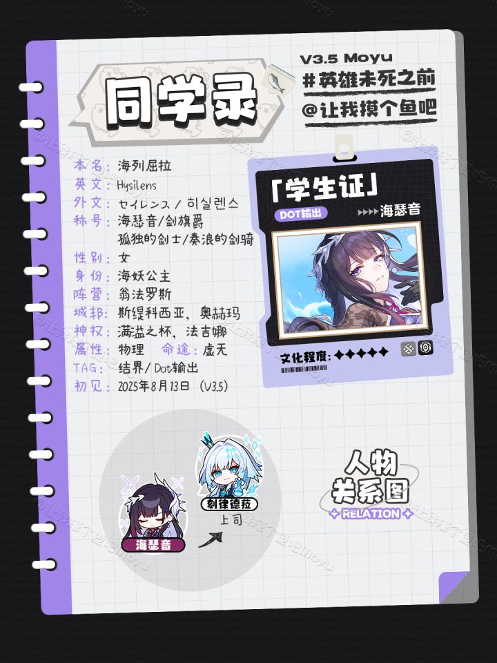 UID:104347362将将!我是摸鱼🐟 (。•̀ᴗ-)✧DOT队新成员来袭,是海的女儿!(冲啊,DOT队赛高!)本期的主角就是他 —— 骑士统领·『海瑟音』!—————— ฅ՞• •՞ฅ ———————接下来是本期的《摸鱼小课堂》时间!海瑟音坠坠重要的机制,一!定!要!看!懂!—————— ฅ՞• •՞ฅ ———————🔘创作不易,严禁任何商业性转载及搬运🔘制作难免会有错漏