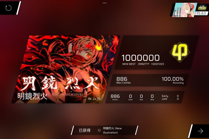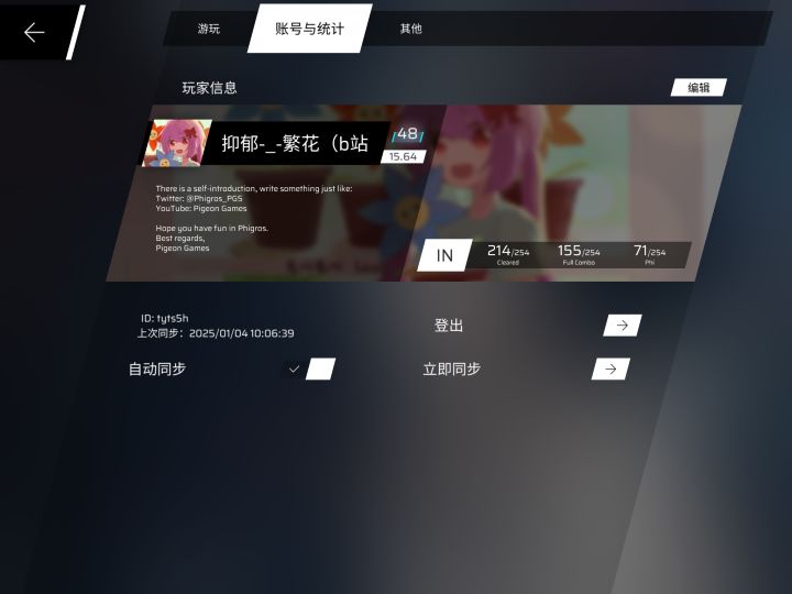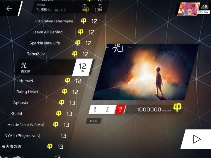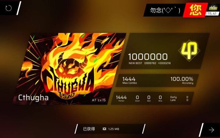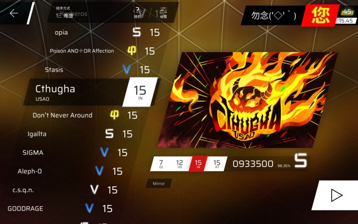 前天收的,大前天打了一下午,性了两遍,没收成。前天是终于收了,为什么我今天才发呢?我也不知道,第一个收的at。顺带说一下,in不会打,大佬快教我#phigros#音游#cthugha#收歌
