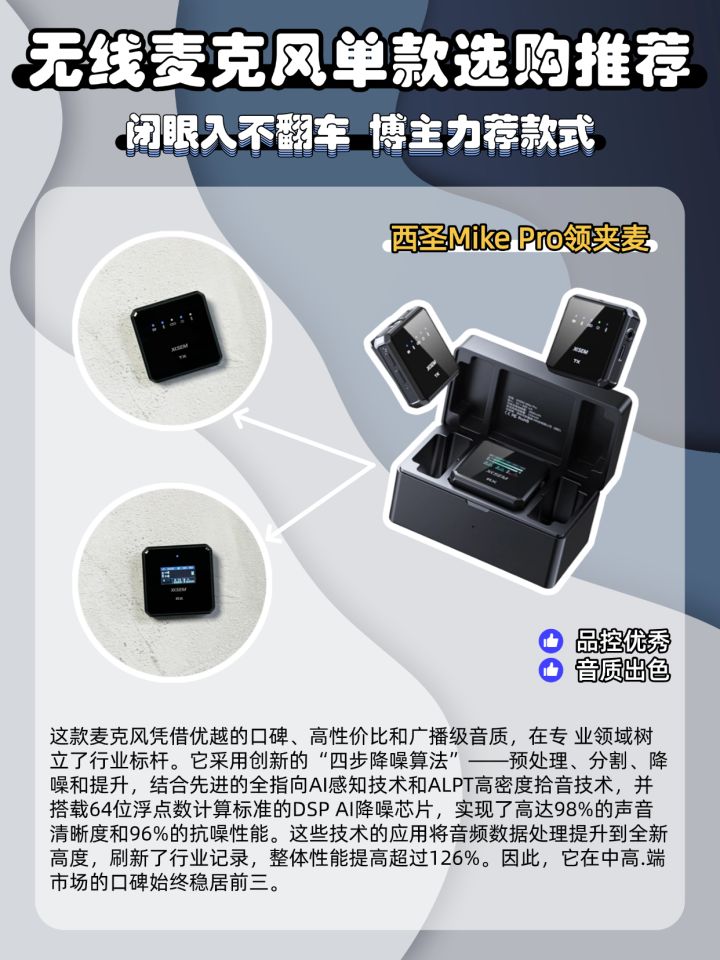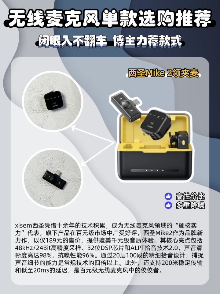 总觉得录音差点意思?以前用普通领夹麦或耳机麦,声音要么模糊发闷,要么背景杂音盖过人声,听着像隔了层纱,后期怎么调都救不回来。 直到换上西圣Mike2,才知道好麦能有多省心!它的第2代ALPT高密度拾音技术很贴心,哪怕轻声说话也能清晰收录,不会出现忽大忽小的情况。48kHz/24bit高精度采样更让音质质感拉满,声音自然干净,细节都能捕捉,根本不用后期费劲调EQ。 遇到嘈杂环境也不怕,四重PSN