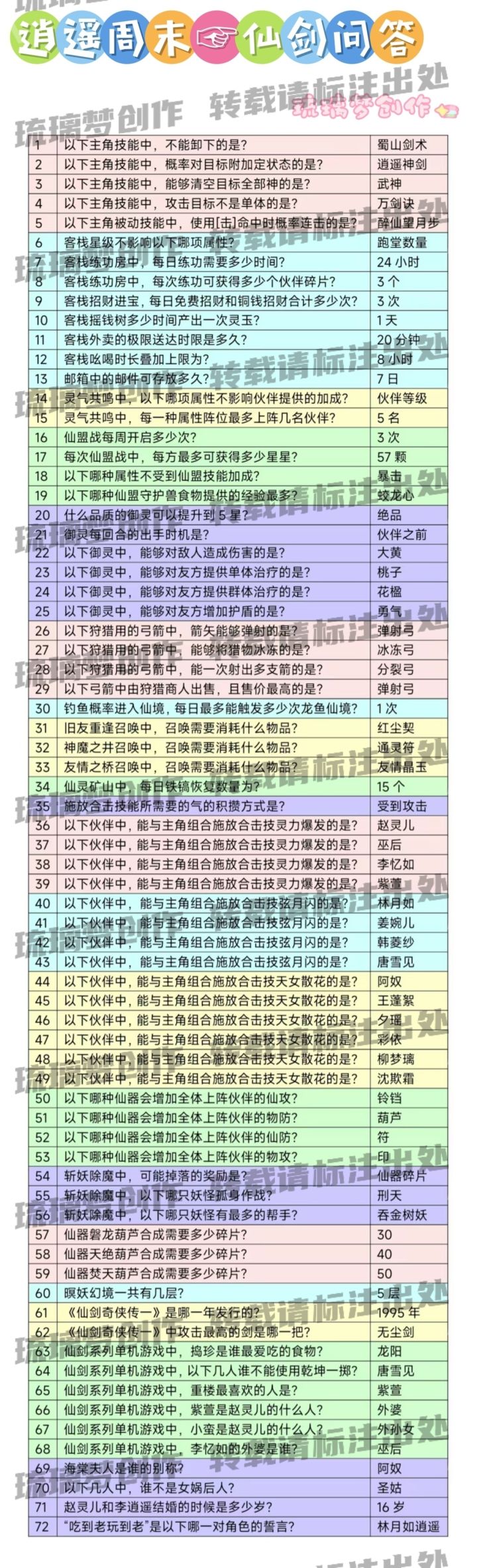 逍遥周末 仙剑问答题目攻略1 、以下主角技能中,不能卸下的是?答:蜀山剑术2 、以下主角技能中,概率对目标附加定状态的是?答:逍遥神剑3 、以下主角技能中,能够清空目标全部神的是?答:武神4 、以下主角技能中,攻击目标不是单体的是? 答:万剑诀5 、以下主角被动技能中, 使用[击]命中时概率连击的是? 答:醉仙望月步6 、客栈星级不影响以下哪项属性?答:跑堂数量7 、客栈