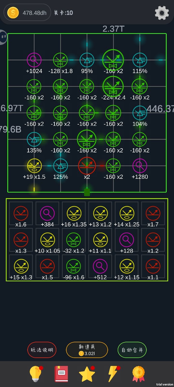 有bugbugbug它只会给我两种道具(说好有五种的)这是一款机制极其简单的休闲物理效果“游戏❓” —— ——首先 游戏有引导,还有视频引导(点个赞)游戏大概是通过光的物理效果(散射、折射…等“道具”)使从固定点出现的光源数值或进行加法或乘法增加,这个“数值最终变为金币”,金币还可以购买更多的随机道具然后不断循环这个过程膨胀最终获得的数值 —— ——可以说游戏只做了个基础,也不知