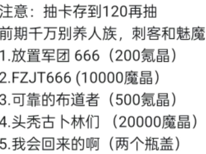 文末十月兑换码,宝物攻略 首先,氪晶不要直接抽奖。 氪晶商店有打折瓶盖,魔王点,工人,猪猪存钱罐,必买。还有副本刷新券看情况买(非酋建议直接买)。 填邀请码领取1000氪晶:jcwgph开局的免费强制10连抽或30选10刷猪骑,一直重置刷到为止。 如果你想T0开局,然后时间很多的话开局的十连三选一和强制10连,分别刷一个猪骑哥炮,猪骑影魔或者哥炮影魔。 1-20三选一紫魂石,一定选哥勇