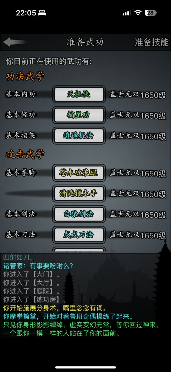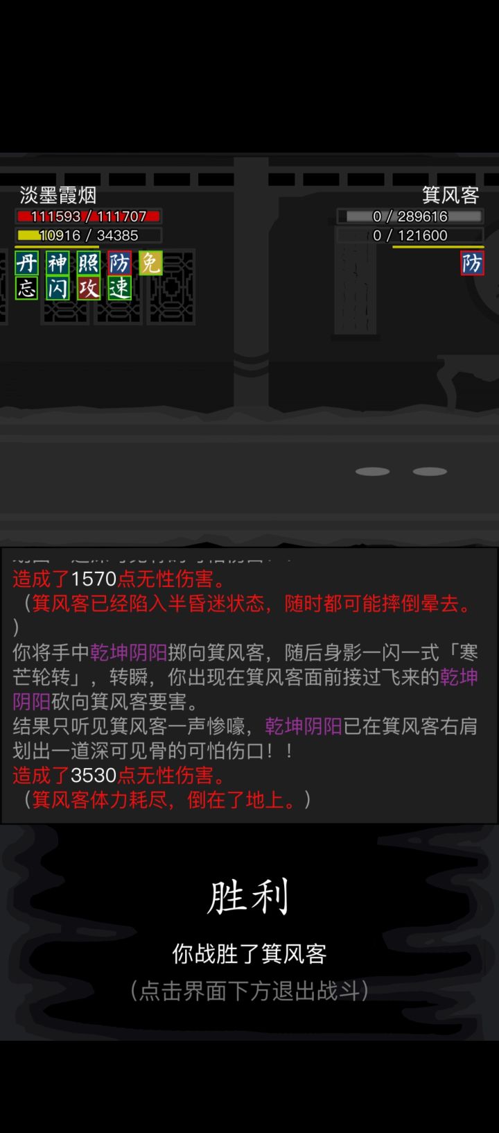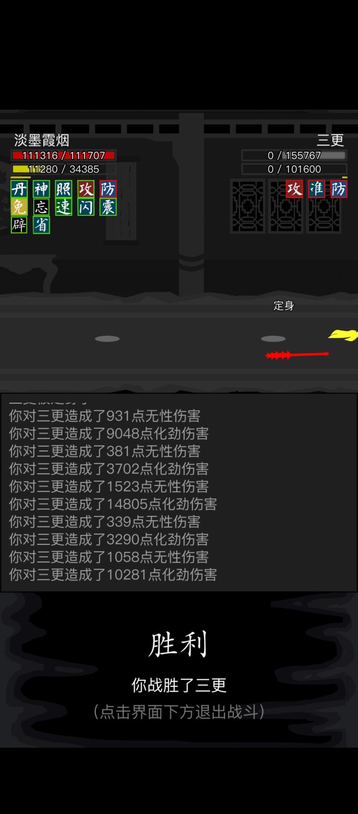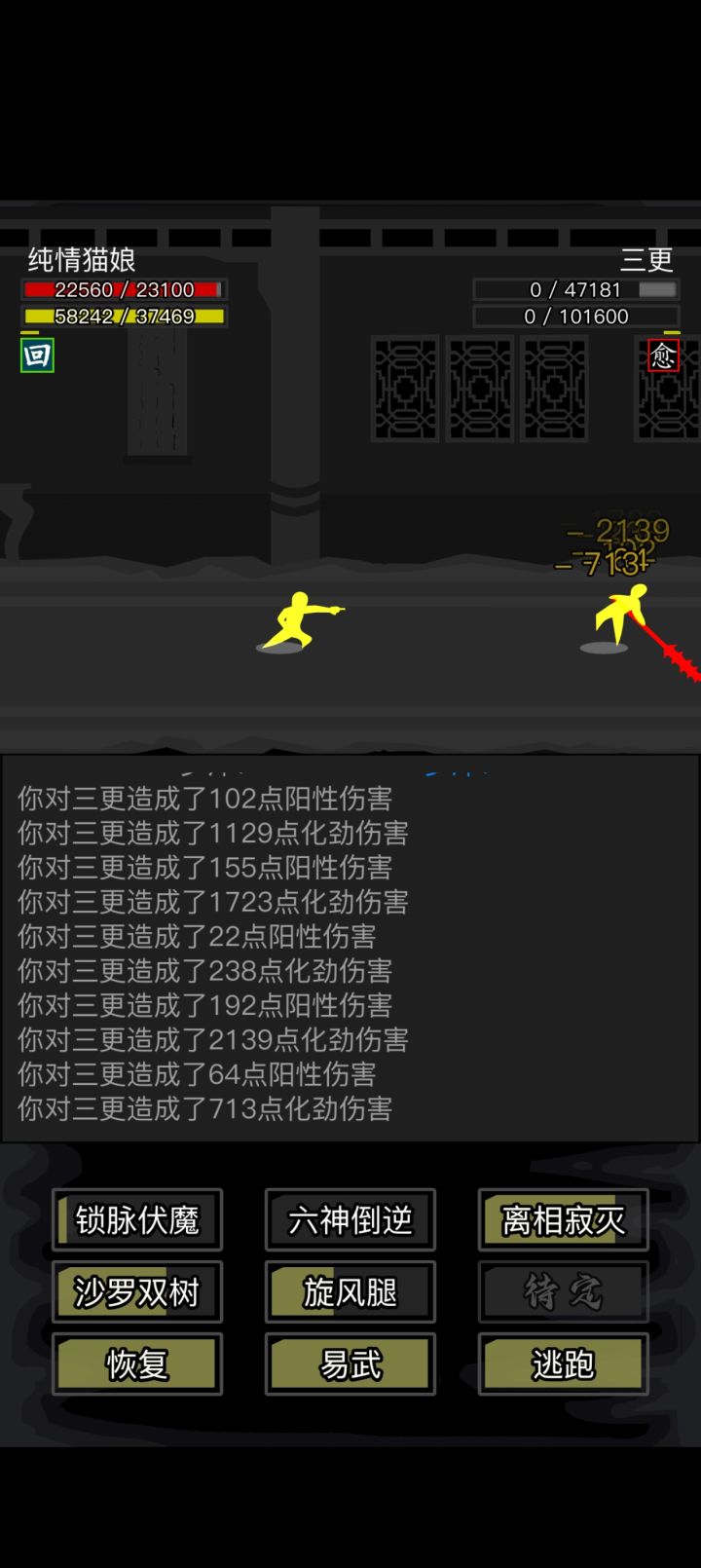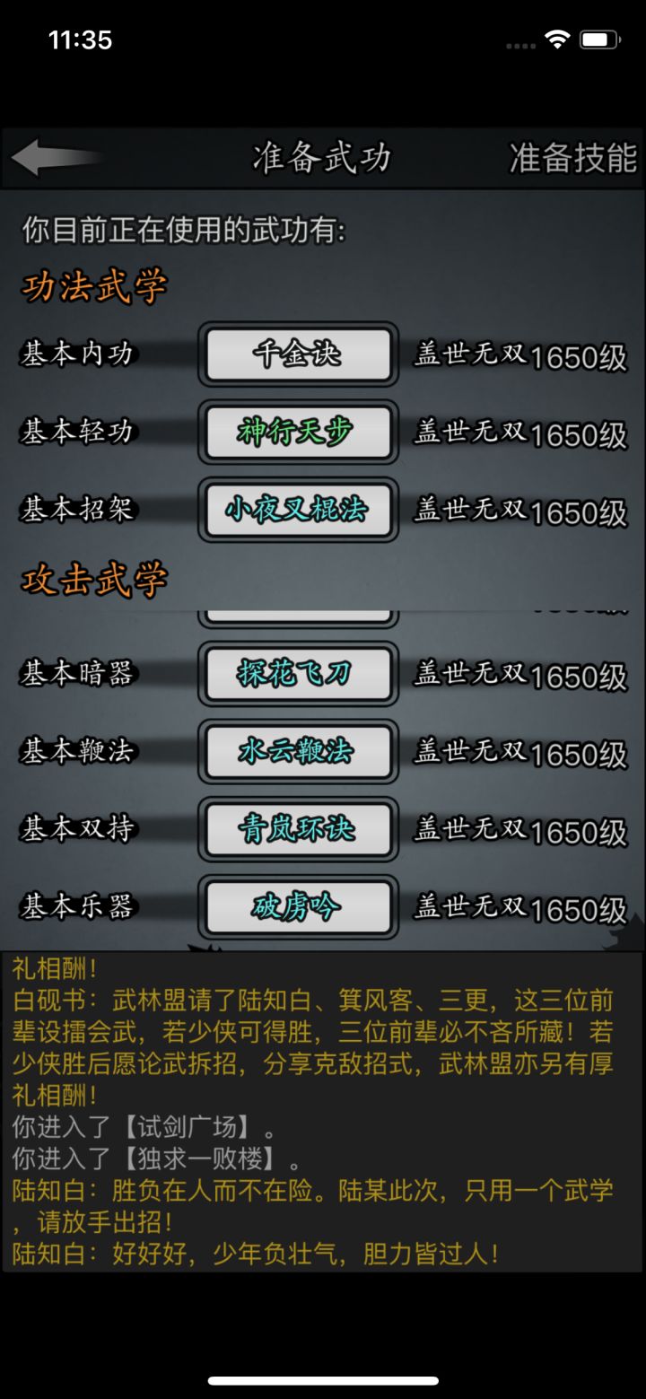 #放置江湖三英会武 用的都是同一套,海鲸帮的水刀和踏浪步加潜龙护宝,改个低加力就随便打了,等对方用完内力,也就过了。其中箕风客麻烦一些,因为会心眼通和空洞,于是就备用一把刀然后放一边看戏。自己有灵照经所以空蓝也没事,等他没内力了易武掏刀就好,就是内力最终还是没能回满 。