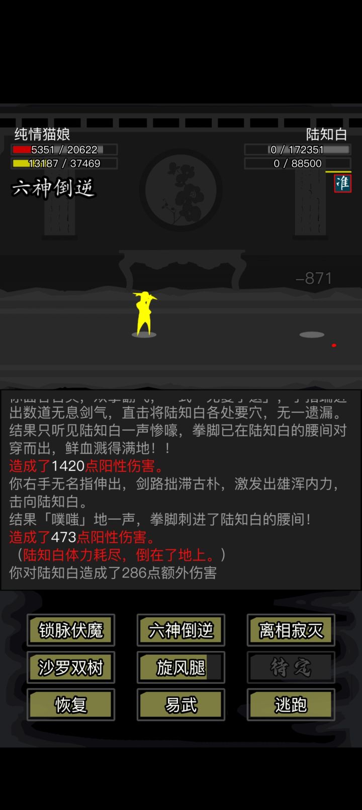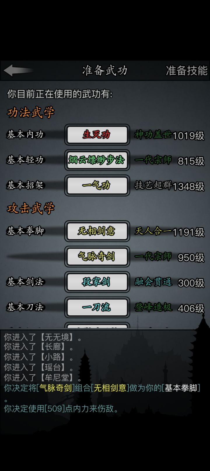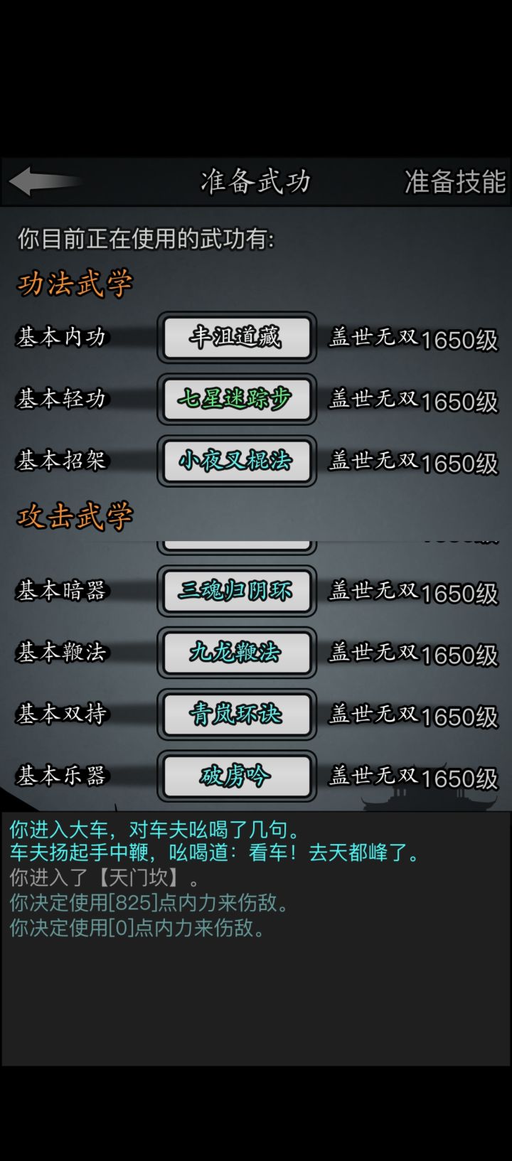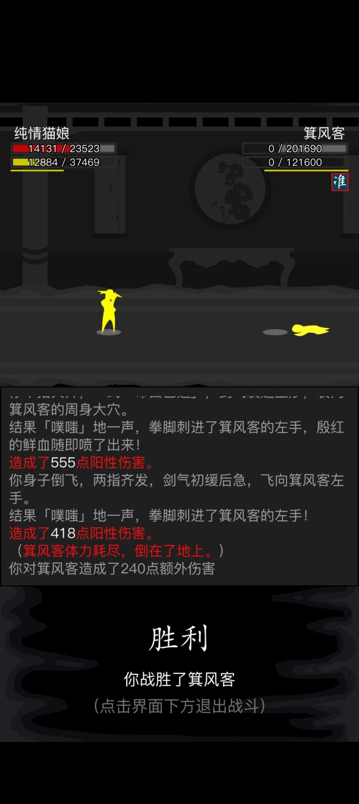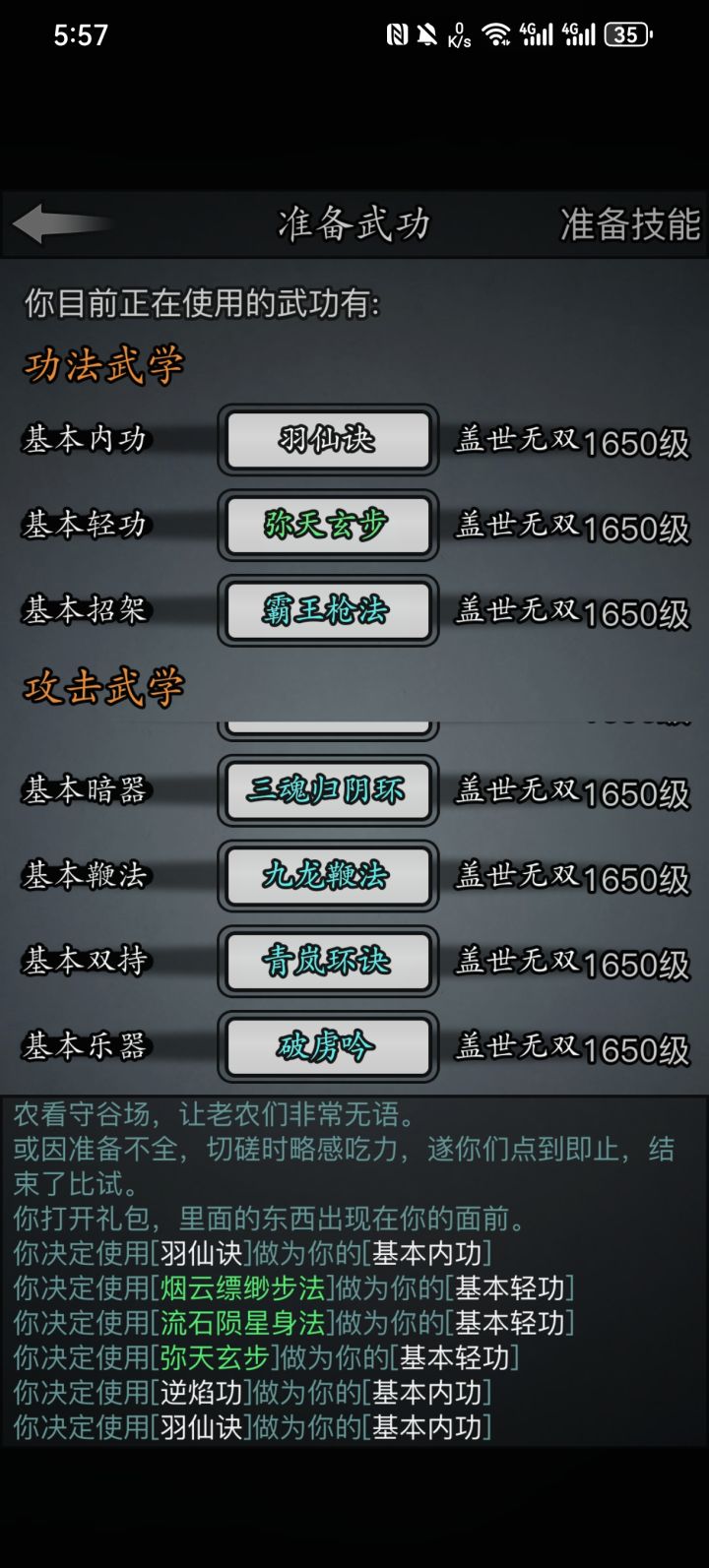 #放置江湖三英会武 用的都是同一套,海鲸帮的水刀和踏浪步加潜龙护宝,改个低加力就随便打了,等对方用完内力,也就过了。其中箕风客麻烦一些,因为会心眼通和空洞,于是就备用一把刀然后放一边看戏。自己有灵照经所以空蓝也没事,等他没内力了易武掏刀就好,就是内力最终还是没能回满 。