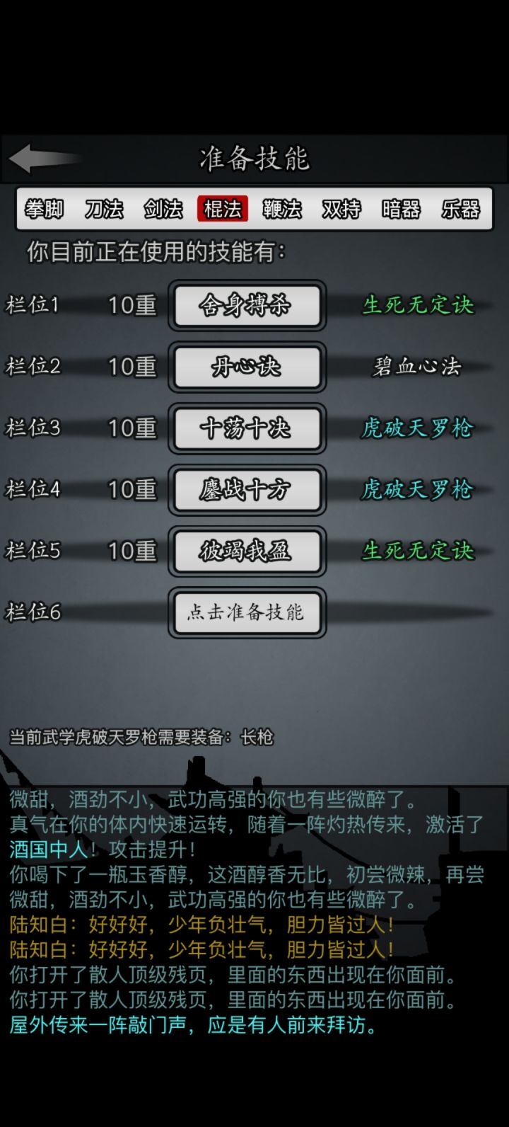 #放置江湖三英会武 活动的三英血量很高,对付血牛最简单的方法就是掏出化劲来应对。这边面对三英,我选择的三江湖搭配,霸王枪主要是选择使用神兵战戟来挂破防buff增伤化劲,各位少侠可以选择其他的武学和神兵来替代,例如青岚神兵双环的破防,神兵短剑的破防,拳脚系统里的破防等。在对局中,战戟所带来的破防增伤非必须,各位少侠可以选择其他武学来优化对局,对于内力缺少可以换成神兵笛子,重剑和其他回内的武学;对于缺