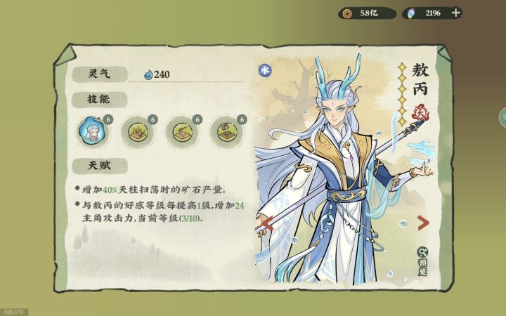【天级帮工敖丙】帮工:敖丙五行:水技能:收获、播种、浇水战斗技能满星预览:每0.3秒1次,发射1枚追踪海龙弹,自动锁定最近敌人,造成100%的伤害并施加持续3秒的30%减速。海龙弹命中后,对目标后方扇形区域的敌人造成100%的范围伤害。天赋技能满星预览:1、增加40%天柱扫荡时的矿石产量。2、与敖丙的好感等级每提高1级,增加24主角攻击力,上限240。人物故事:东海龙王三太子,