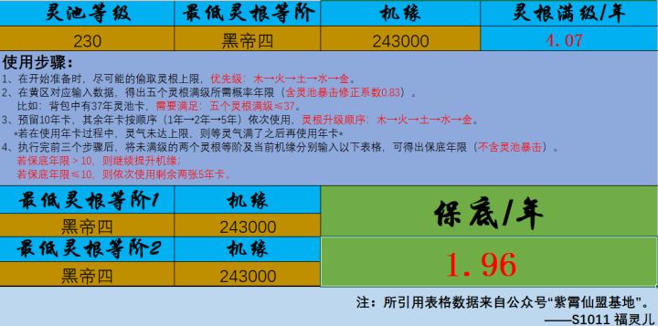步骤:1、在开始准备时,尽可能的偷取灵根上限,优先级:木→火→土→水→金。2、计算出当前五个灵根升满级所需灵气年限×85%(家园灵池暴击率15%),由于预留了10年卡保底,可适当增大暴击百分比,尽量不要超过20%。公式如下:*五个灵根升满概率年限=满级所需灵气➗(0.5✖️机缘➕灵池灵气加成)➗36✖️85%3、预留10年卡,其余年卡按顺序(1年→2年→5年)依次使用,灵根升级顺序:木→