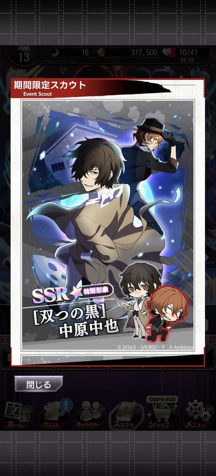 巨想要双黑,太宰治和中也,但是这个池子,感觉光看看就会双眼一黑晕过去,从开始肝到现在一共出了三个金,歪两个织田作(真的是太有缘了),然后四个UP的卡就出两个首领的双人卡,可恶啊,我想要太宰和中也#文豪迷犬怪奇谭