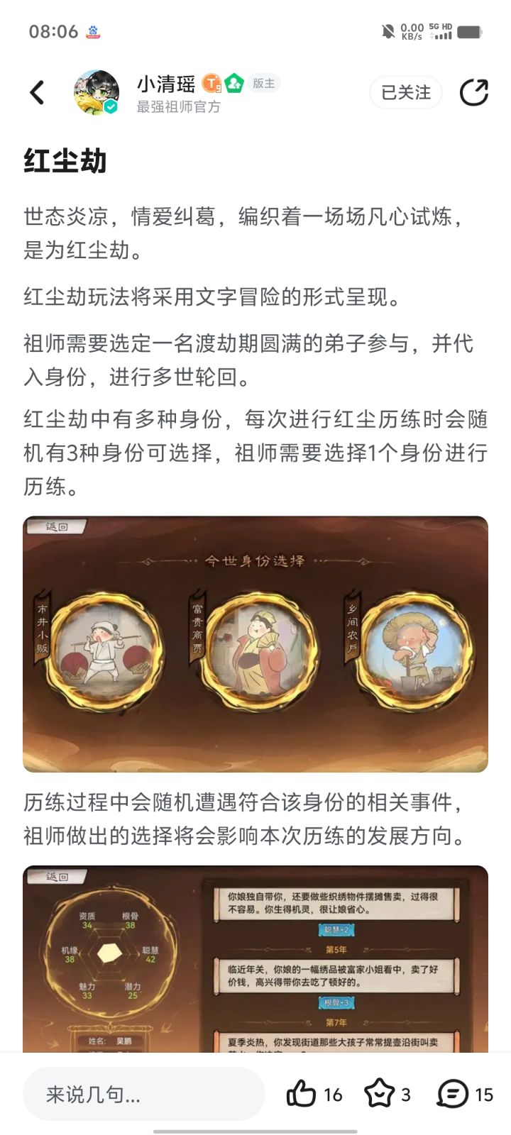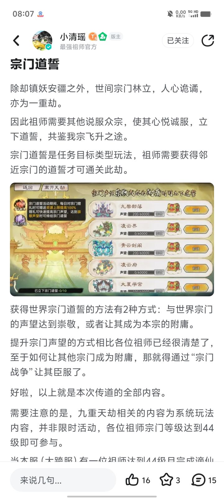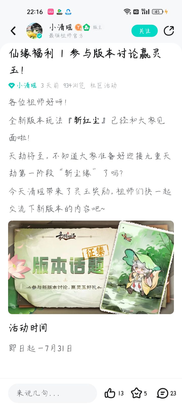 各位祖师好呀!全新版本玩法『斩红尘』已经和大家见面啦!天劫将至,不知道大家准备好迎接九重天劫第一阶段“斩尘缘”了吗?今天清瑶带来了灵玉奖励,祖师们快一起交流下新版本的内容吧~活动时间即日起—7月31日参与方式带上 #斩尘缘 标签,在论坛以长帖、图文、视频等形式发布攻略、同人二创或者“斩尘缘”版本讨论内容,即视为成功参与活动。活动奖励活动结束后,小清瑶会从发帖符合要求的祖师中挑选3