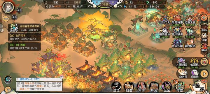 现版本资源生产效率过低,甚至不能自给自足!斩尘缘很需要大量资源送礼,难度较大。#斩尘缘 建议:九重天劫仙门开始,一缕仙气入凡间,官方公告会提高宗门声望获取效率。建议把“仙界气息”buff加一条大幅增加宗门生产效率,我在凡间生产的慢可以理解,仙气都出发灵草灵木等长的快点不是很贴合实际?可以有效缓解大量的资源消耗,而且大部分玩家更加愿意拿玉买体力提升宗门声望,毕竟资源就是战力#斩尘缘