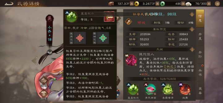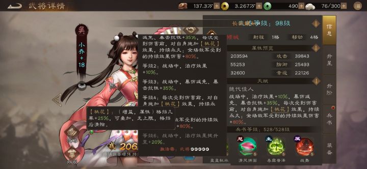 #新三国志曹操传军机品鉴团 #新三国志曹操传 #新三国志曹操传军机品鉴 #新三国志曹操传创作者征集令 #新三国志曹操传地宫探险 大乔升级版奶妈,被动持续伤害增伤,伤害减免,未来在演武、沙盘有着较好的就业环境。推荐8星、12星。专武3星开局增加免伤还不错,可以考虑3星专武没有专武也没试,被动免伤也不错。