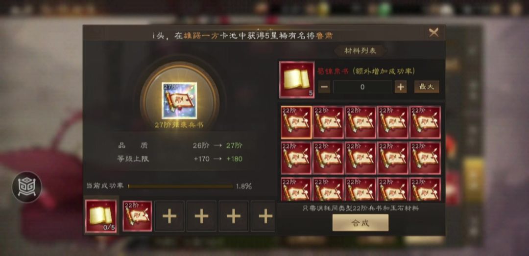 看有大佬用10来本22阶兵书强升26阶到27阶,成功率只有1.8%…因为之前26升27弄到98.多的成功率都失败了一次,整整浪费10张红纸,合计把这个损失拉回来,结果60多本22阶兵书全部失败,无一幸免,惨不忍睹,果然赌狗最终一无所有,合兵书这个几率真挺玄幻的,说到底全看脸,1.8几率可能几下就成功了,98成功率也可能一无所有,所以啊,这玩意就随缘吧,没啥最好的合成方式,如果稳扎稳打攒够百分百的材