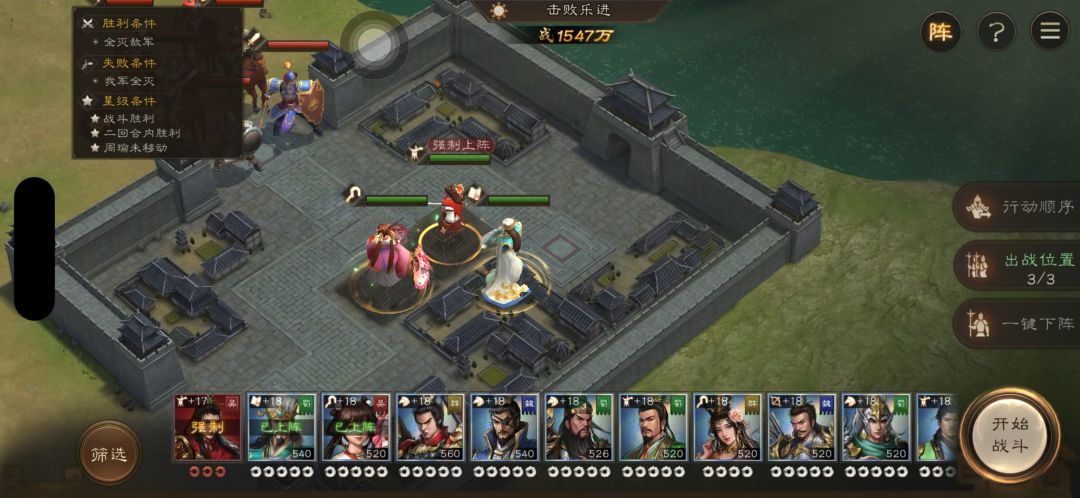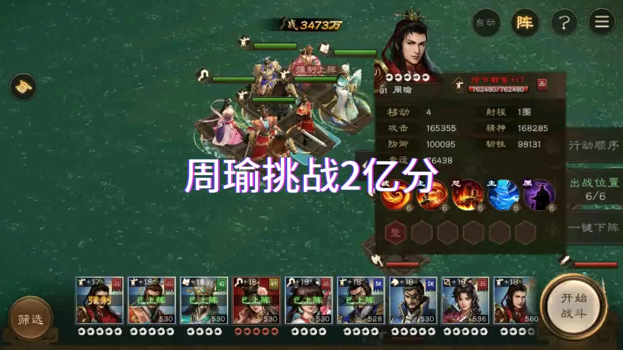 #新三国志曹操传创作者征集令 #新三曹金秋福利盛典开启 上阵周瑜 小乔,这夫妻俩必上,另外一个电灯泡选任意高练有持续伤害的武将都行,我这里上的丞相。 练度周瑜用的活动养成的,基本无练度。小乔满星带3星神兵。丞相也是满星带3星神兵。 开局周瑜原地放火烧敌人(三星过关要求周瑜不可动),丞相也上去放火,小乔上buff。 第二回合周瑜原地开大。 三星过关。