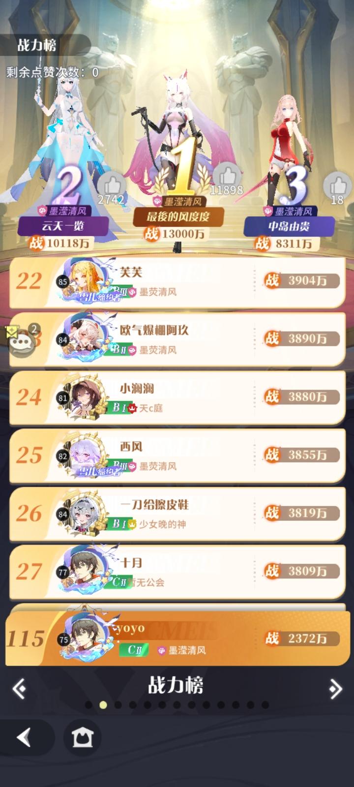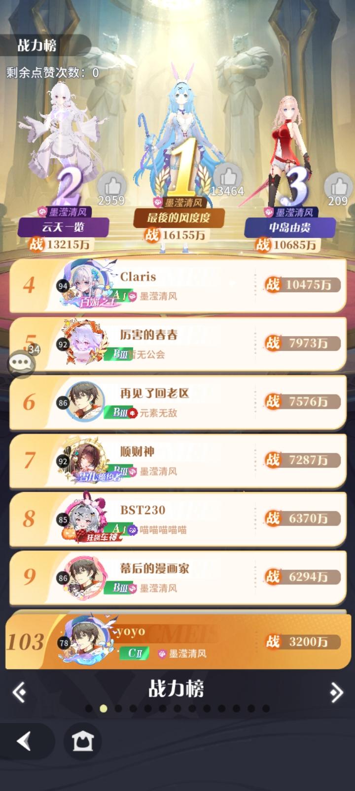 新区开荒的第7天,各种活动已接近尾声,是时候做个总结的(划掉,其实只是因为天极角色命运三姝出来了)。新区天极角色本体的获取,已经需要看脸了(保底:30抽。重点来了:1.钻石只能买20抽。2.活动到期后回收抽数)。截止此刻,洒家战力排行第14名。(这排名听起来有点不太妙鸭,我也不想的)。新区7日开荒总结(仅为一家之言,小伙伴们请轻拍)。新区入坑玩家建议:1.基础资源该用星钻买就买,千万别省,会卡关,