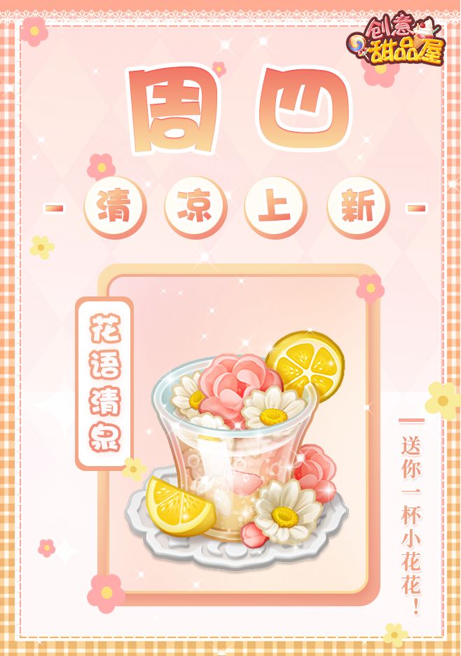 店长们好啊,你们七夕情书的战绩怎样了呢?七夕活动明天即将要结束了,现在是不是在冲榜单了呢?晒出来给管家看看,你们现在的排位是多少,让管家羡慕一下。这周延续上周的小清新系列,甜品屋推出一款【花语清泉】。管家送店长们一杯小花花,特别地温暖和治愈。一口下去,特别清凉解渴。跟着管家来看看本期新品吧~看着这杯酸甜可口的新品,店长们是不是特别想立刻拥有呢管家的独家秘方,即刻送上!管家的仓库蜂