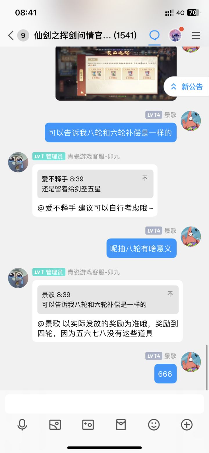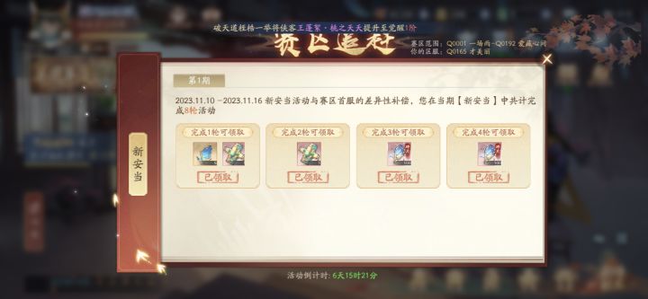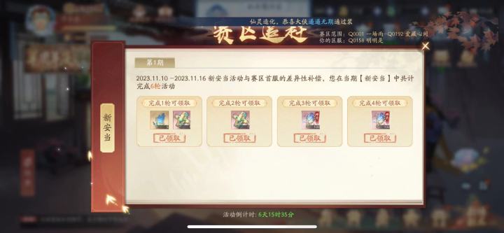 今天是11.5号 这是目前的金龙和票数我们服第一次新安当是11.11-11.17本人只买双月卡 基金和寻宝 目前43级对了,还有签到 闪卡 005小号代捐 吃席 白嫖活动全部拉满 11.6号 好消息金龙长了一万 坏消息 开服狂欢没结束就要合服了 11.7号今天花了30玉龙买姑苏卷,有点小后悔11.811.9今天发现拿姑苏换点绿卷可以凑出来第二轮幸运