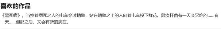 不知春喜欢的作品《黑死病》原型应该是《鼠疫》。《鼠疫》(La Peste)是诺贝尔文学奖获得者法国作家阿尔贝·加缪创作的长篇小说,也是其代表作,1947年首次出版。 该小说讲述了20世纪40年代某年的一个4月,北非的奥兰城突发了一场灾难性的瘟疫,成千上万的人丧生在病魔之下,奥兰沦为与世隔绝的一座“孤岛”。面对厄运,投机取巧大发横财、消极抵抗毫无建树、积极应对勇敢反抗者皆有之,不同的人做出了不同