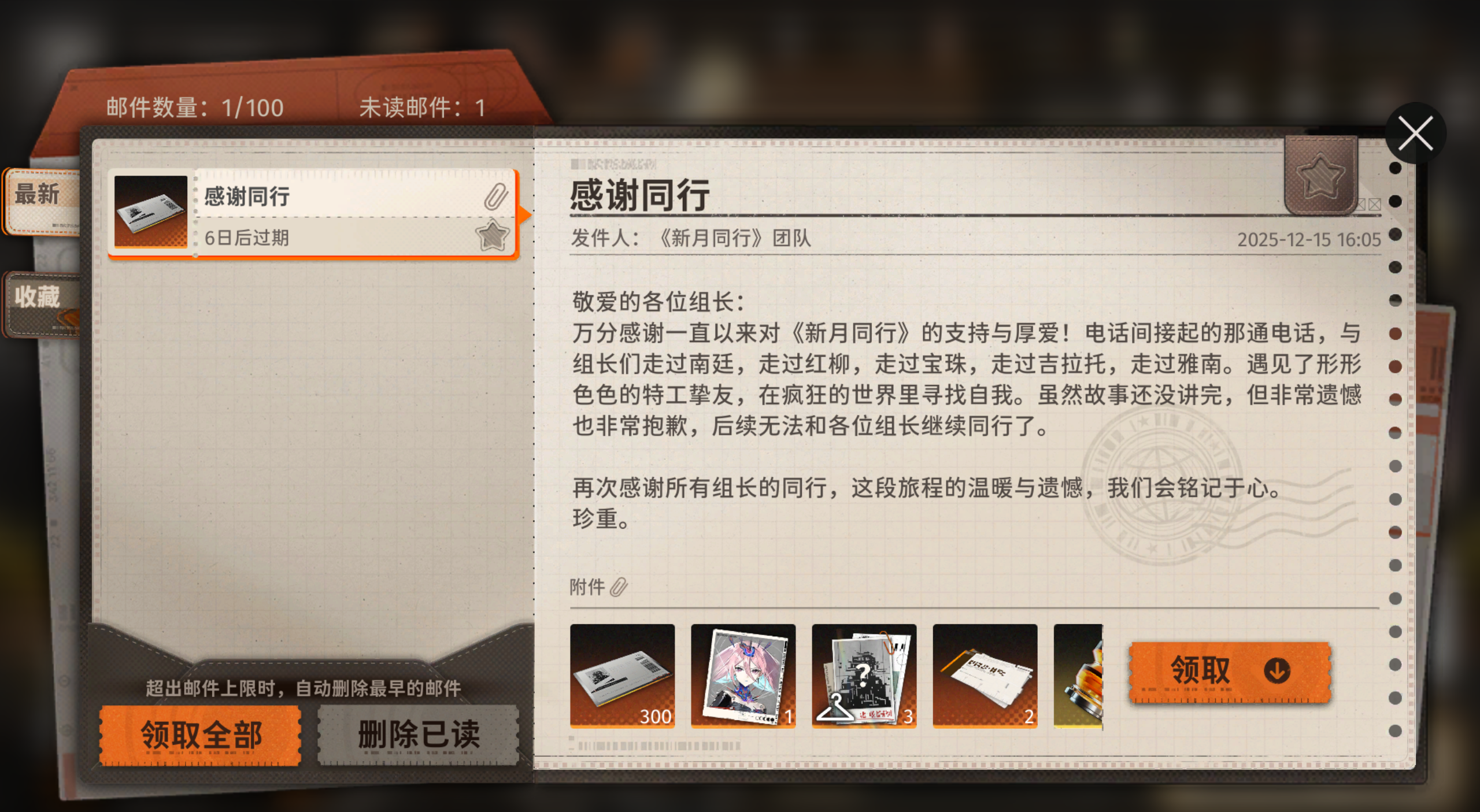 作为一个开服玩家,我永远记得那个在宿舍躺着打开这款游戏的下午,也永远记得在那间电话间接起的那一通电话。虽然不知道为什么毫无征兆地停更了,甚至明明前段时间才刚热热闹闹地度过了周年庆...我以为这款游戏还能陪伴我更久一点。🥲无论如何!我跟随着橙刀锋的脚步,一路也收获了许多!还有很多组长也会带着大家的理想一起前进的对吧!与新月同行,与你我同行,与自我同行...晚安,新月。希望你只是一段时间的安眠,