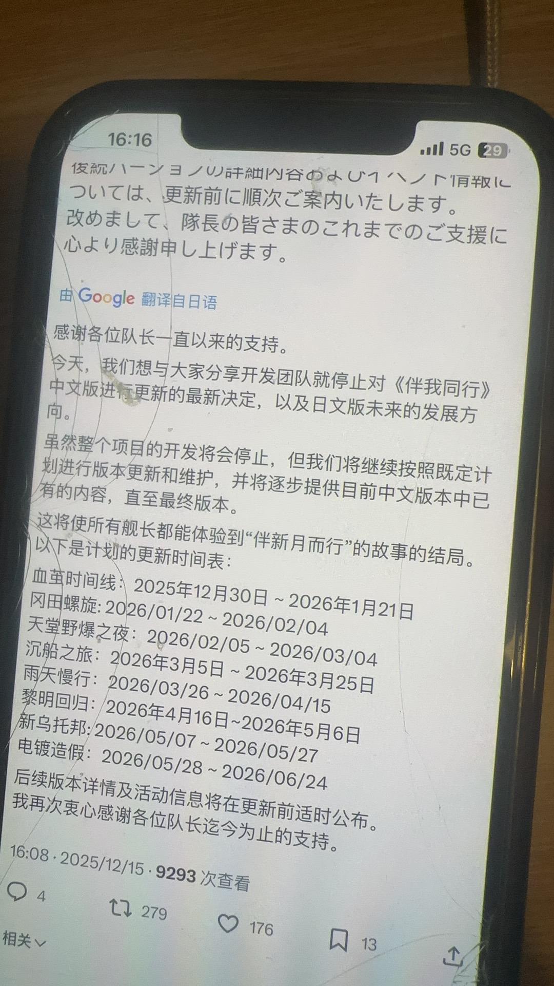 敬爱的各位组长:万分感谢一直以来对《新月同行》的支持与厚爱!电话间接起的那通电话,与组长们走过南廷,走过红柳,走过宝珠,走过吉拉托,走过雅南。遇见了形形色色的特工挚友,在疯狂的世界里寻找自我。虽然故事还没讲完,但非常遗憾也非常抱歉,后续无法和各位组长继续同行了。经过项目组审慎的考量,我们非常遗憾地宣布:《新月同行》将于2025年12月15日版本更新后,停止更新。停更后,组长仍可正常登录。从立