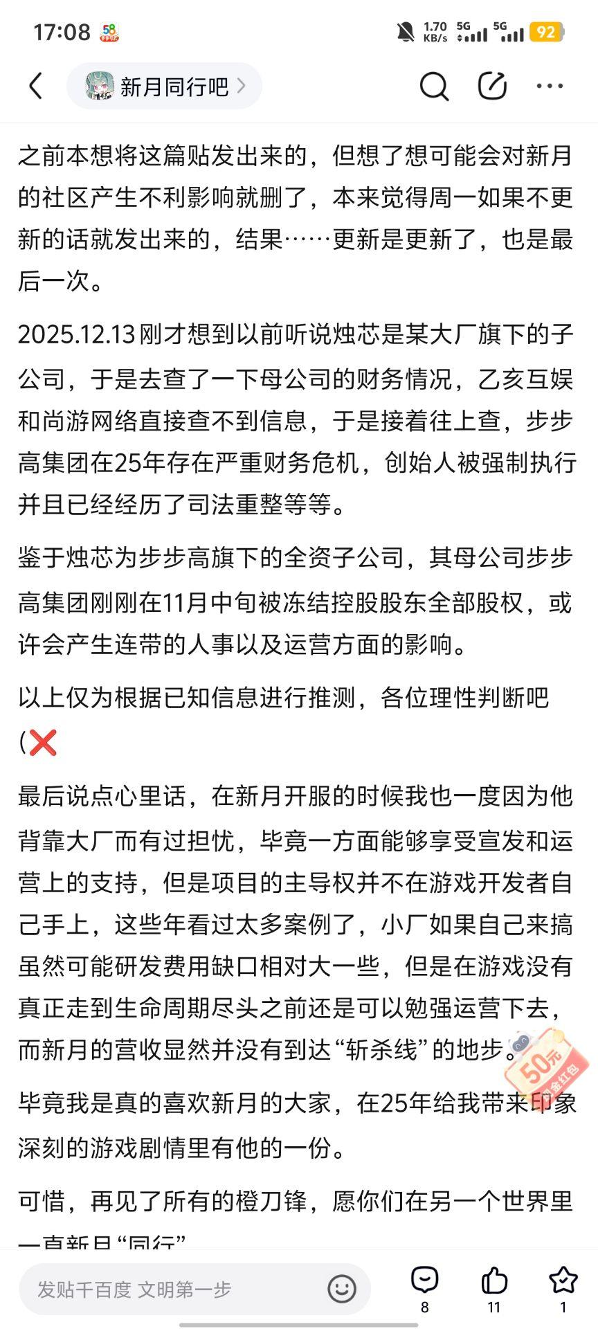 刚过完一周年就官宣停更,《新月同行》这波操作确实让人懵——从公测到落幕才417天,连主笔白伯欢都感慨“千言万语如鲠在喉”。 但平心而论,官方这次收尾算有诚意:,终章补完了鸣霜的故事线,锈血支线也填了坑,没让“广式新怪谈”的世界观烂尾。补偿更是直接拉满:限定角色“血锈鸣霜”+全套门阶、300抽电话卡、自选6星特工… 几乎把能给的都塞给了玩家。不拖泥带水,明确停充停注册,还承诺30号出退款方案