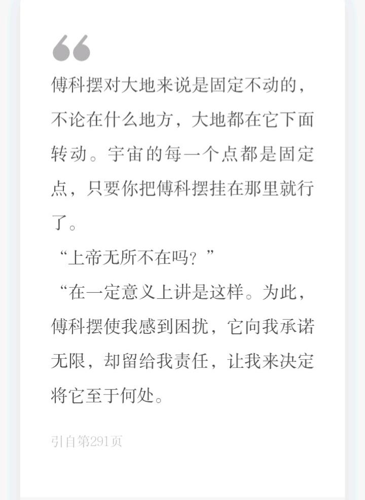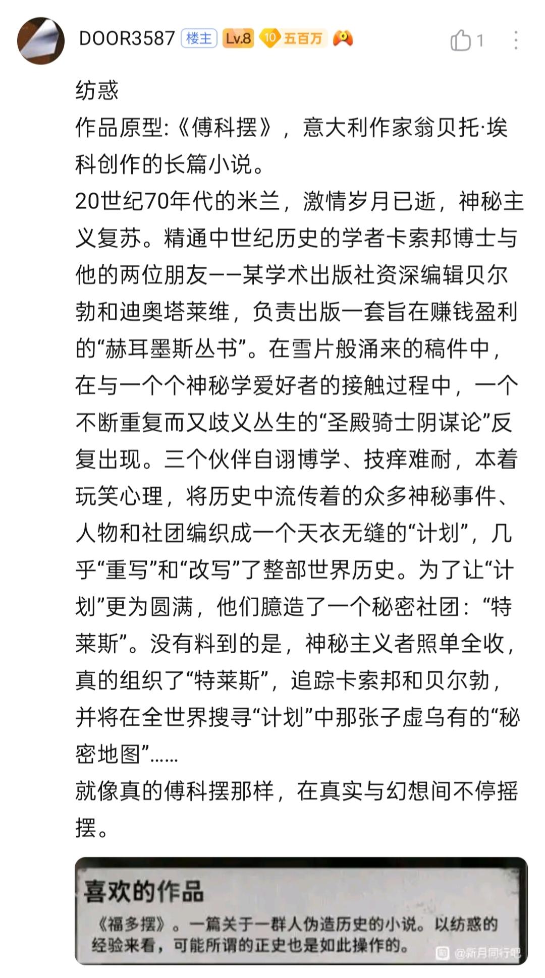 P2-3,满信赖档案。生日8.24。P4,特工备注P5-8,喜欢的作品。《福多摆》。一篇关于一群人伪造历史的小说。以纺惑的经验来看,可能所谓的正史也是如此操作的。➡️《傅科摆》,长篇小说,作者(意)翁贝托·埃科。P7-8是几句小说原文。P9-10,引申一下,傅科摆是一个用来证明地球的自转的物理实验装置。1851年,法国物理学家莱昂·傅科通过此装置证明了地球的自转。在无外力推动下,单摆摆