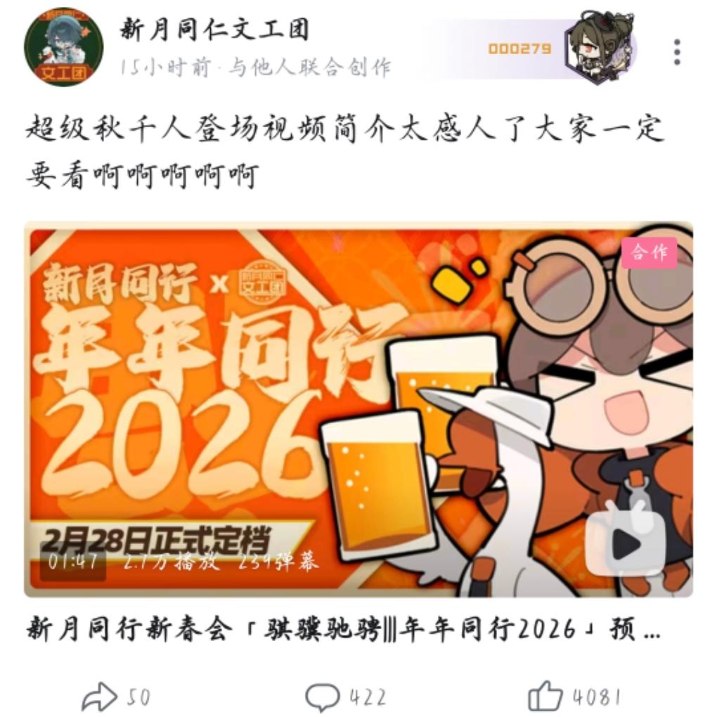 1月20日消息,《新月同行》民间同人爱好团体【新月同仁文工团】发布动态,宣布《新月同行》民间新春会「骐骥驰骋|||年年同行2026」BiliBili游戏新春会参与确认,新春会直播将于2月28日 19:00正式上映。《新春会》是BiliBili游戏新年活动的一种形式,通常由官方或者民间爱好者团体组成,在每年年末上演,视频时长1小时起步,内容包含各种同人二创,是游戏爱好团体对游戏表达喜欢的形式。因
