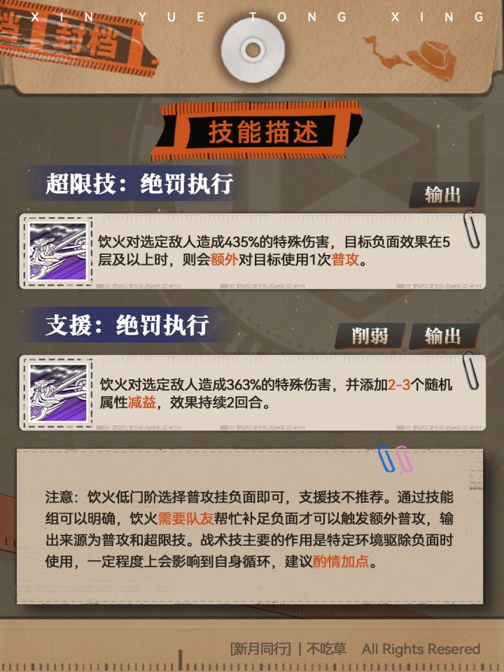先总结,饮火的整体强度非常值得期待,无论是从技能组设计,还是认证天赋的直接收益,都能看出来制作组对饮火的强度非常上心,毕竟成男出的非常少,想稳住就在强度加点料咯,我已经蠢蠢欲动了,但小保底如果歪了当我没说下面简单分析下饮火技能组:普攻『暴动』:aoe技能,为全部可选敌人添加随机属性减益并造成伤害。现存唯一一个无概率无自伤的aoe,甚至挂debuff的普攻技能,无论是作为伤害技,功能性技能,还是