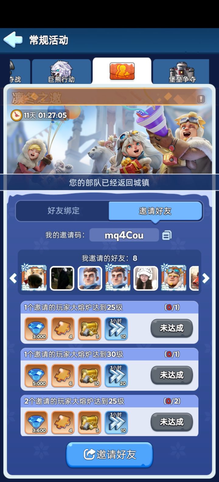凛冬之邀绑定好友,奖励丰厚,如若有心求绑定! 常规活动 --> 凛冬之邀 --> 输入邀请码! 25级炉子/邀请码:JBleQx游戏兑换码,亲自尝试过,大家放心使用: TILI520 WJDR111 WJDR222 WJDR333 WJDR666 WJDR16 WJDR899 WJDR988 WJDR2025 WOAIWJDR #无尽冬日新手攻略 #无尽冬日或 #无尽冬日