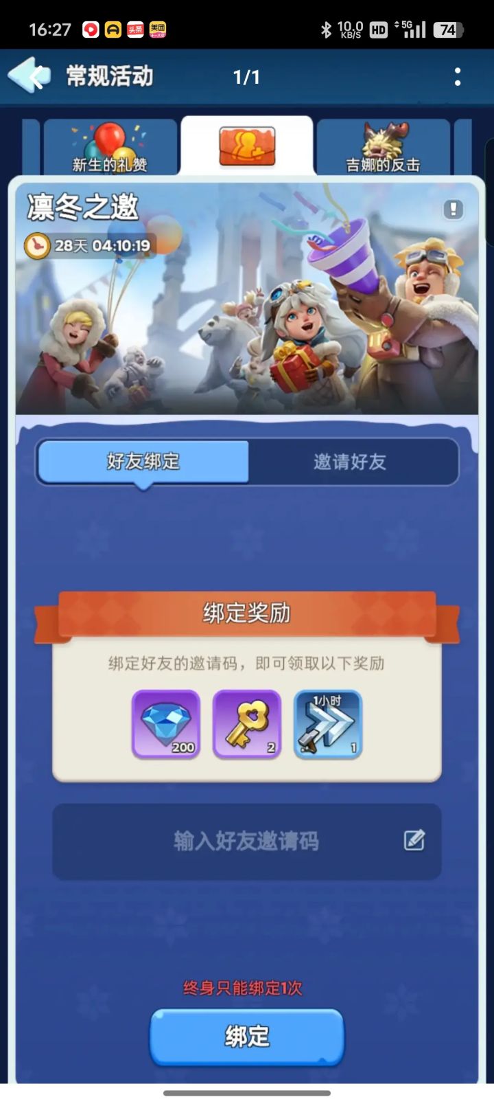 常规活动>凛冬之邀: E6J9jT 填完立领可以绑定拿奖励!#无尽冬日 #无尽冬日七夕 #无尽冬日兑换码 #无尽冬日表情包 #无尽冬日礼包码 #无尽冬日新手攻略 #无尽冬日或 #无尽冬日排行 #无尽冬日角色 #无尽冬日玩家退坑指南