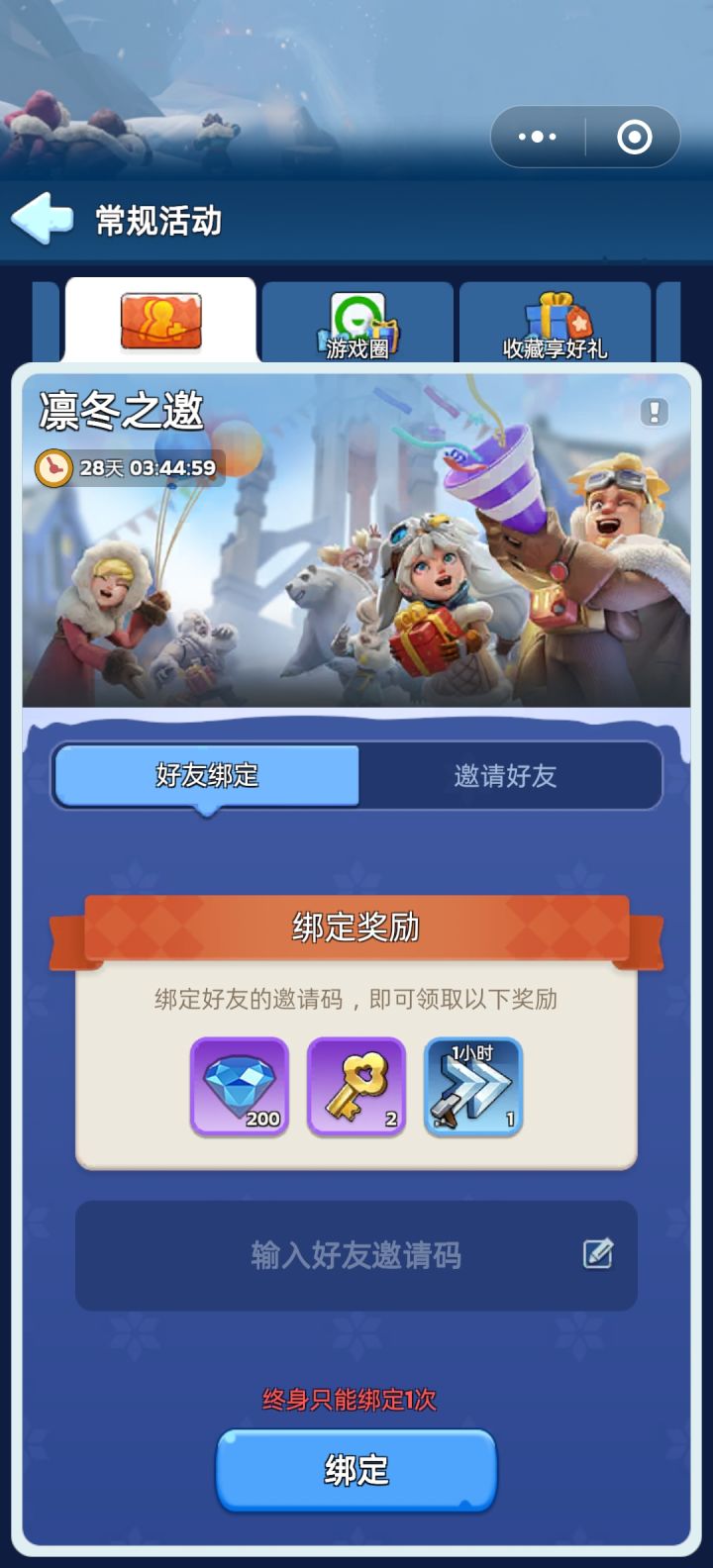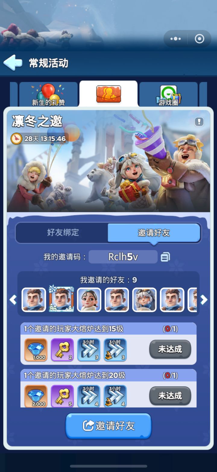 常规活动>凛冬之邀: E6J9jT 填完立领可以绑定拿奖励!#无尽冬日 #无尽冬日七夕 #无尽冬日兑换码 #无尽冬日表情包 #无尽冬日礼包码 #无尽冬日新手攻略 #无尽冬日或 #无尽冬日排行 #无尽冬日角色 #无尽冬日玩家退坑指南