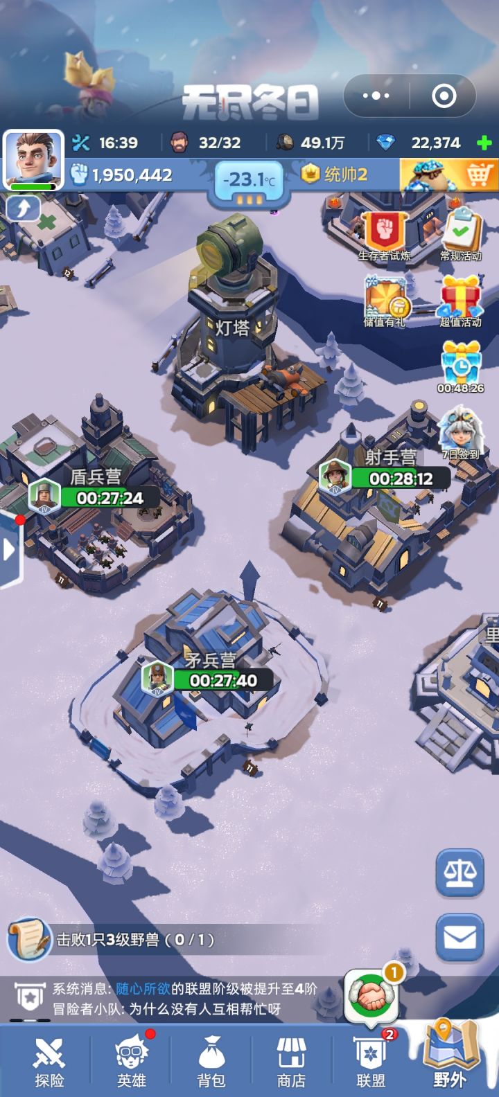 新手攻略,首先简单说一下这个游戏框架熔炉就是主基地,升级建筑就需要资源 资源主要有:生肉、木材、煤炭、铁矿 这四个资源对应的主要建筑:猎人之家、伐木场、铁矿厂、煤矿厂。厨房主要是为幸存者(就是基地的工人)提供食物,医务室是提供工人生病医疗的地方,初期有40%概率是医疗不好至死。初期基地到7级之前都只是基本都是只是升级资源建筑,7级后就要进行兵种建筑升级,4级可以进行探险,探险是唯一能获得钢