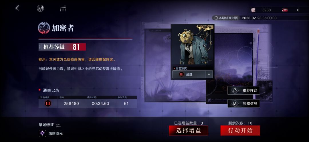 新梦魇一共五个难度评分达到了开启下一难度,难度越高积分越高,建议大家先解锁难度哦,不然一万二很难刷。 #无期迷途 #无尽梦魇离城难渡 #无期迷途攻略