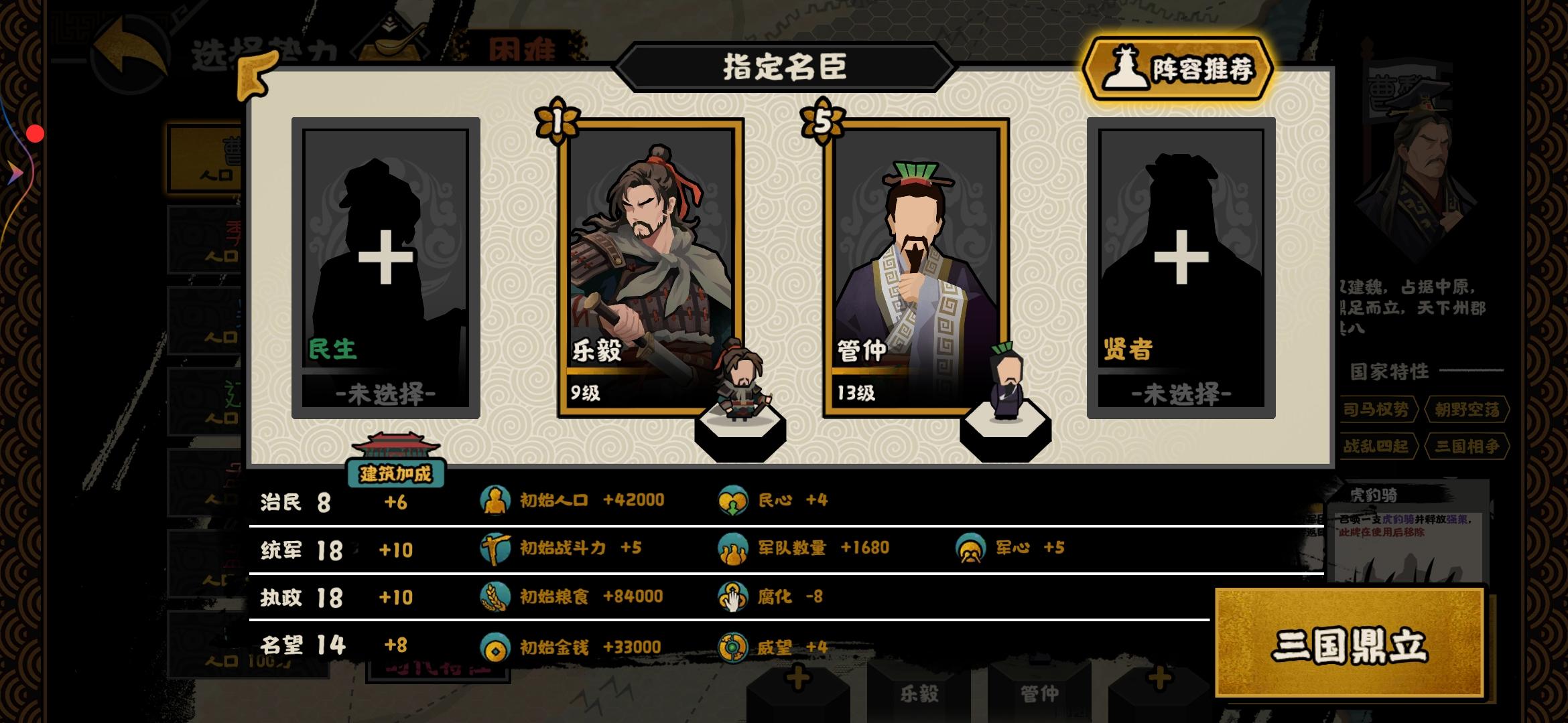 初始威望能达到70那就是轻松过了,完成前4个阶段,注意一下操作技巧就行。没有剪辑,建议倍速播放。 注意事项: 1.开局不点事件对话,等完成前两个要求再点对话可以跳过天塌了事件。 2.三阶段占领疏勒,还是得等用间破坏成功以后再开战。(通常一场战斗就能占领,这局可能是疏勒带的名臣的原因,打了两次) 3.在5阶段结束疏勒对话后一定要快速进入政策界面,通过消耗3点和15点政略的政策调整政略数,消耗光政略。