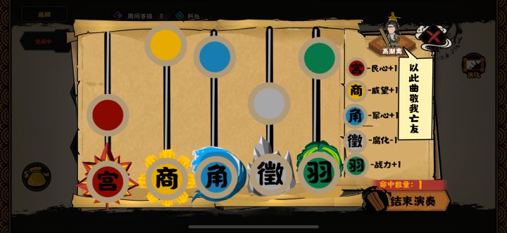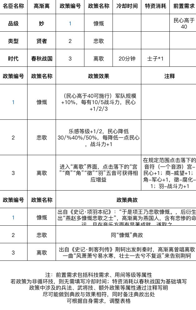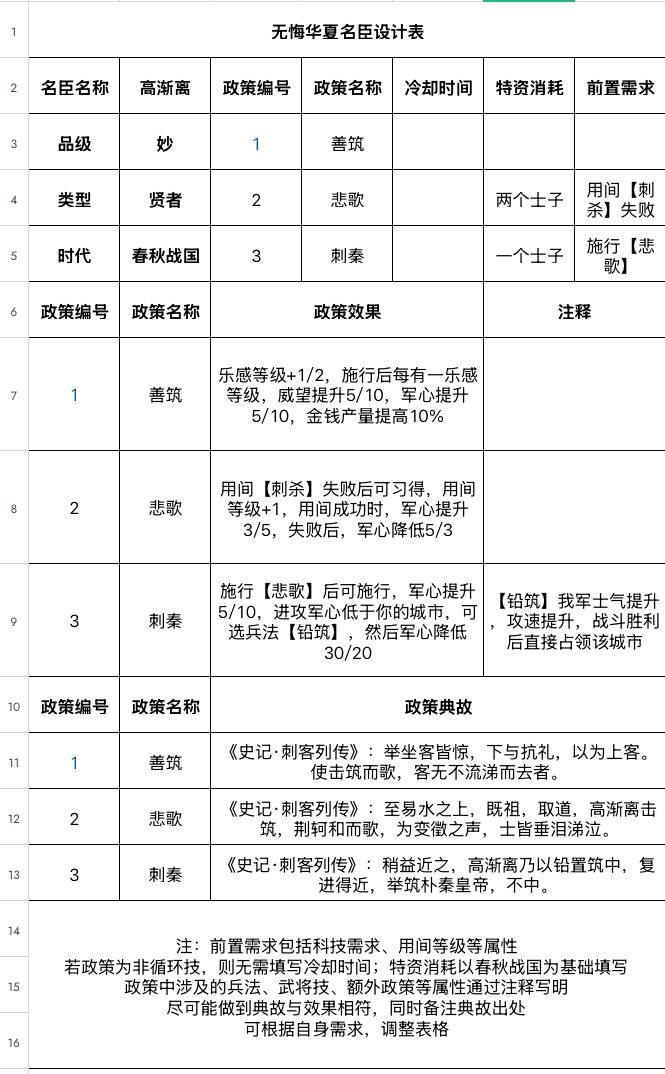 #无悔华夏名臣设计大赛 #无悔华夏 设计思路的话一政策击筑好感度加强取自荆轲与高渐离友情,消耗士子取自高渐离和名师学琴,乐感也是取自高渐离和名师学琴,《史记》记载秦并天下,立号为皇帝。于是逐太子丹、荆轲之客,皆亡。高渐离变名姓为人庸保,匿作于宋子。久之,作苦,闻其家堂上客击筑旁徨不能去,每出言,曰彼有善有不善。从者以告其主,曰:“彼庸乃知音,窃言是非。”家丈人召使前击筑,一座称善,赐酒。而高渐离