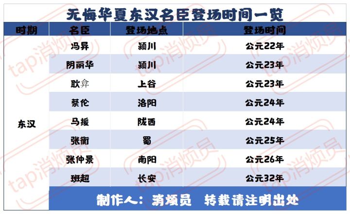 东汉名臣登场地点及时间如图所示名臣 地点 时间冯异 颍川 公元22年阴丽华 颍川 公元23年耿弇 上谷 公元23年蔡伦 洛阳 公元24年马援 陇西 公元24年张衡 蜀 公元25年张仲景 南阳 公元26年班超 长安 公元32年注:场上最多存在4位名臣,请大家注意招募,不要错过。想要了解更多内容,可以点击楼主头像主页查看,欢迎点赞、收藏、关注~#无悔华夏#无悔华夏天选之子#无悔华夏东汉