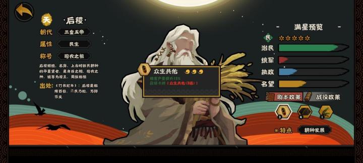 前文赘述:对于无悔华夏这款游戏,本人表示爱的深沉(其实是本人缺少玄玉了,要恰玄玉了)。最近本人实在是忙的焦头烂额,没时间更新。(这是一方面,主要各它奖励给的有些鸽了,没动力更新了)正文:说了这么多,本人将鸽了一个多月的文章逐渐补充回来。首先就先从大禹治水剧本中新出的几个名臣入手讲解分析一下。而今天本人将针对名臣后稷进行分析讲解。 首先本人将满星后稷技能放在这里,请看下图所示。(剧本技能) 众