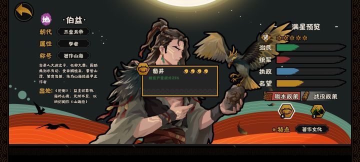 本人今天将鸽了一个多月的文章逐渐补充回来。首先就先从大禹治水剧本中新出的几个名臣入手讲解分析一下。而今天本人将针对名臣伯益进行分析讲解。 首先本人将满星伯益技能放在这里,请看下图所示。(剧本技能) 凿井技能就是加25%粮食产量,感觉很鸡肋,但是也不能说没用处。 山泽鸟兽技能:要求在科技点低于5的情况下才可以触发,增加15%的军队规模,在不同季节触发不同的卡牌神兽,跟后稷打配合还是不错的,增加