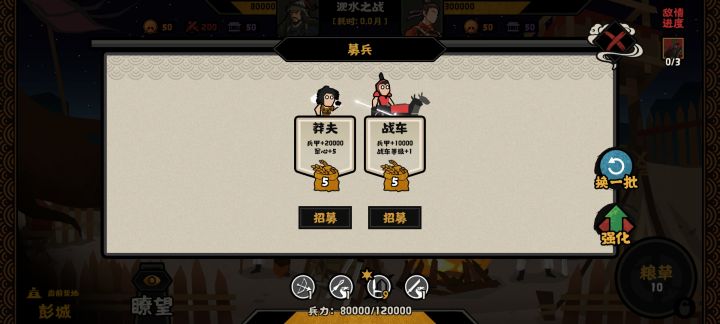 开局还是先强化统军,买每到一个新地方加粮草的。后面要庙算达到才能继续点加粮草的。阵容一直枪兵和苻坚上场就行了,可以打一下3级据点。开局9级枪兵肯定用特色兵种。隐士的话有点用。有时是加防御的。 星罗棋布能买就买。洛涧之后是淝水决战。如果要兵多就买山民。是可以比他兵多。兵多就2、2、2。兵比他少就3、3、0。隐藏结局淝水之战战败就这样。#无悔华夏 #无悔华夏两周年 #无悔华夏两晋 #无悔