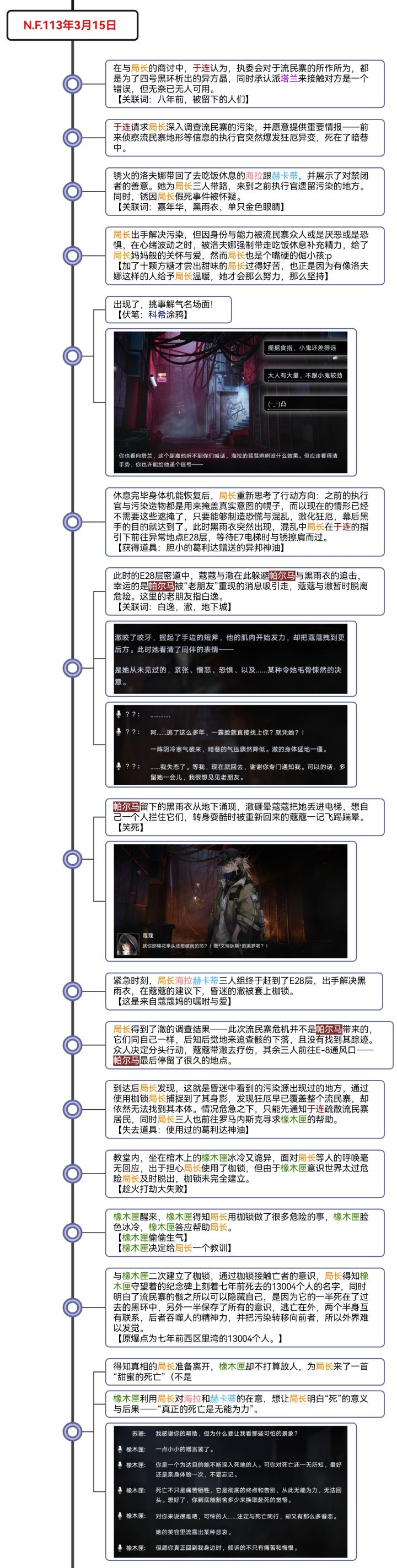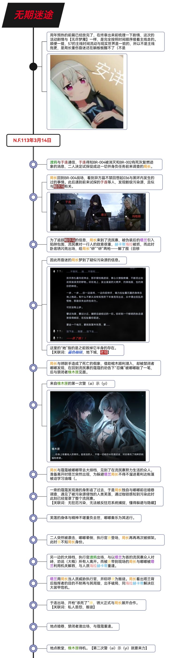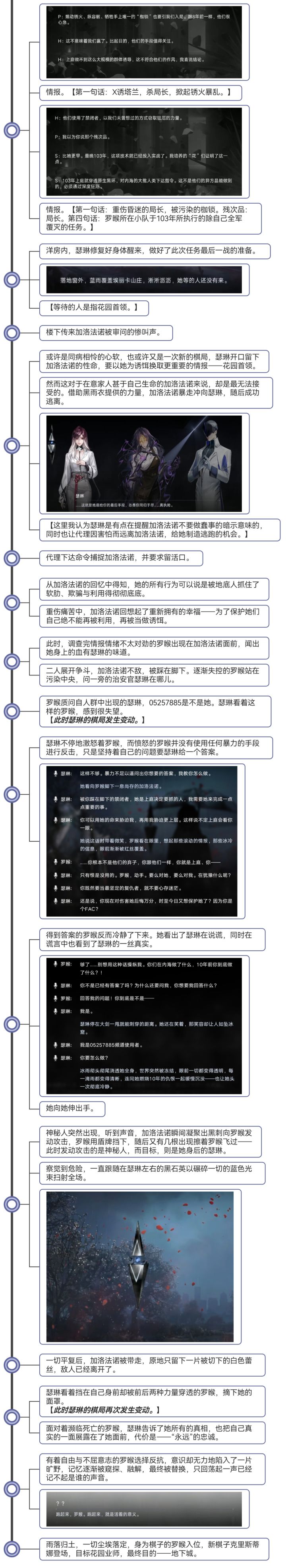 是这样的,上一篇的剧情梳理因为自身时间原因,写完就直接发了出去没有检查,经人提醒有错字漏字后,第二天回看了一下,发现甚至很多语句也不通顺,可以说是越看越看毛病越多,越看越不顺眼。 最开始总结的时候只想着把内容提炼简述出来就好了,于是一个又一个的角色行为被干瘪地列了出来,完全忽视了事件发展的整体性与人物感情的变化衔接,且主视角与地点的切换毫无预兆,给人一种东一榔头、西一棒槌的感觉,这些问题最终导致